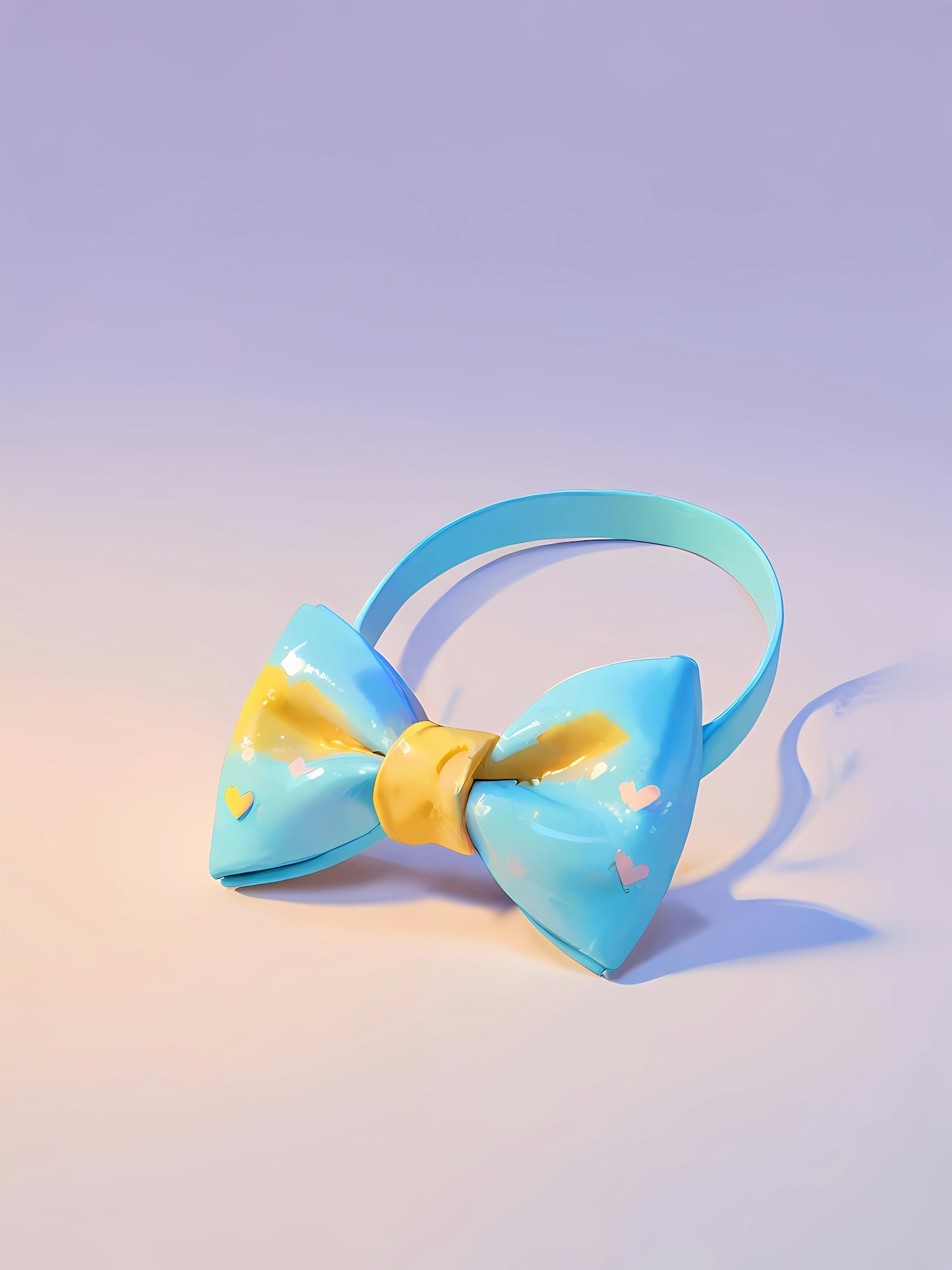 Glossy 3D-rendered blue bow tie with pink and yellow hearts, a yellow knot, and a pastel gradient background. Whimsical and playful design.