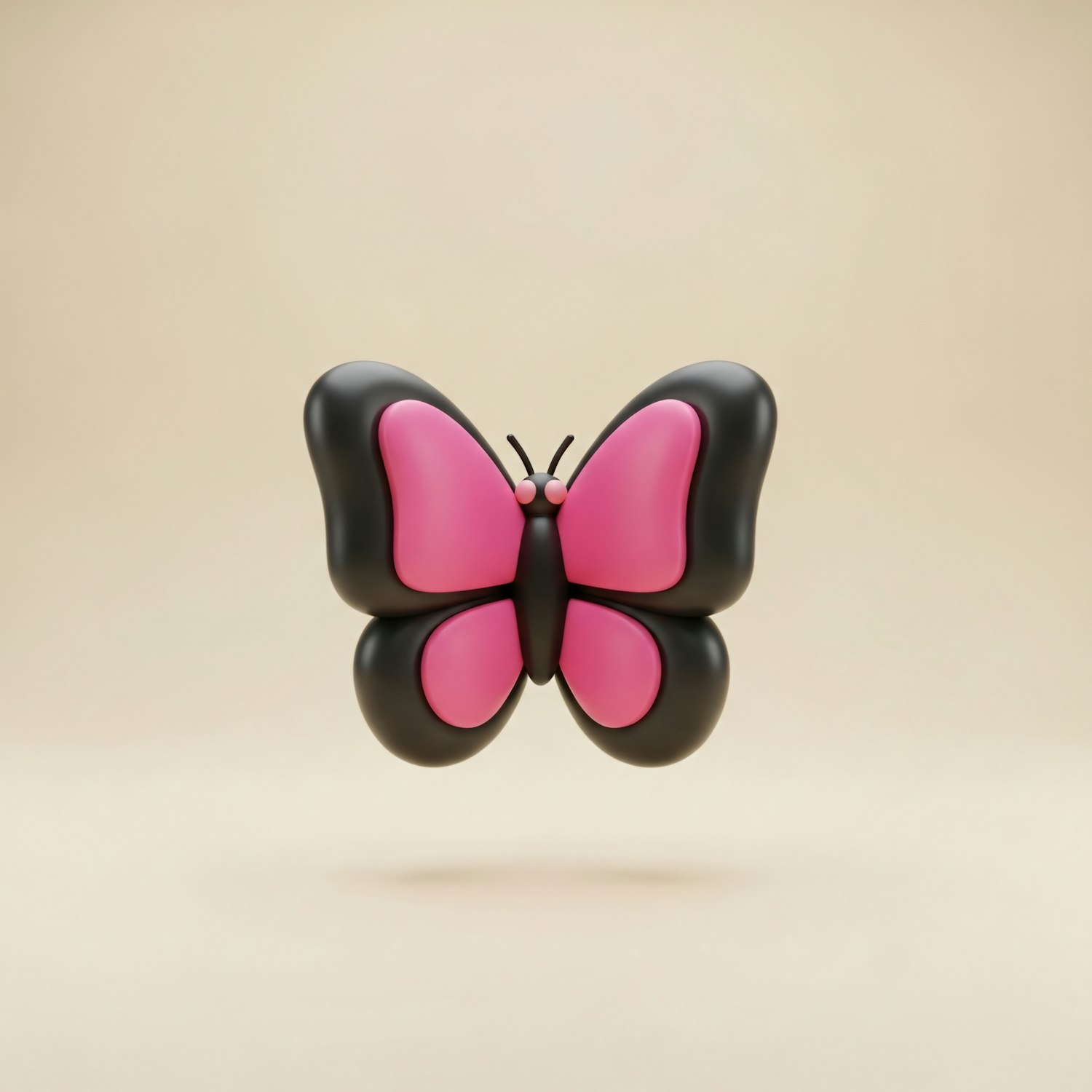 A 3D-rendered butterfly with black and pink wings on a beige background, showcasing a modern and minimalistic design.