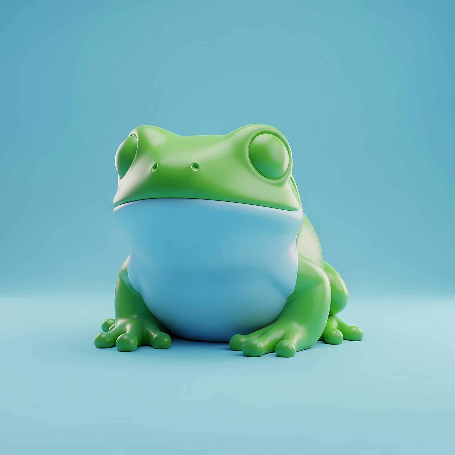 A vibrant 3D-rendered green frog with a blue underbelly, set against a gradient blue background, showcasing a smooth and glossy design.