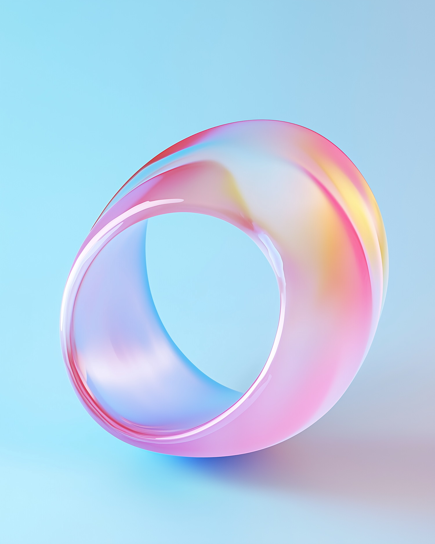 A glossy 3D torus with pastel gradients of pink, yellow, and blue, floating against a light blue background. Minimalistic and modern design.