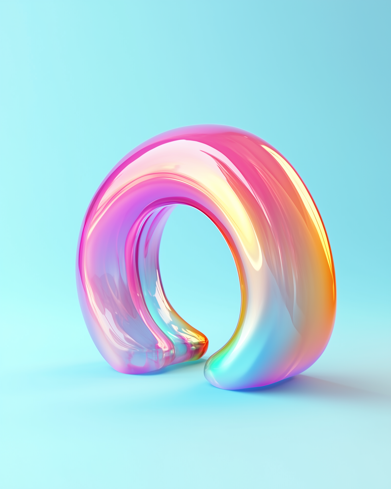 A colorful 3D abstract loop with glossy, iridescent hues of pink, orange, and blue on a soft cyan background. Modern and eye-catching design.
