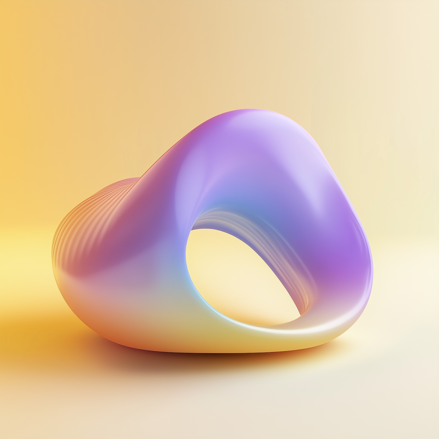 A glossy, colorful abstract 3D shape with soft curves and a hollow center, set against a gradient yellow-orange background.