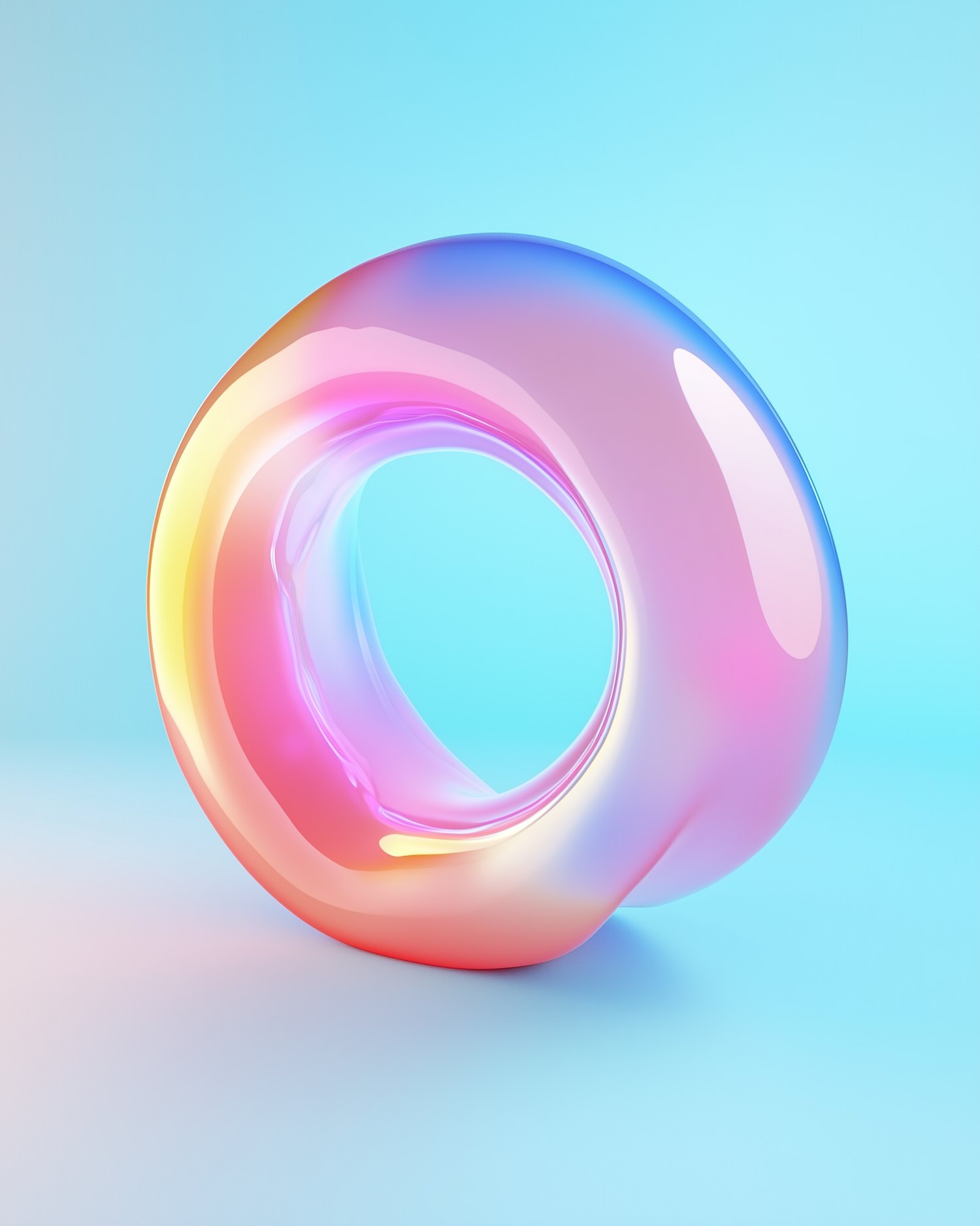 A glossy, colorful 3D abstract shape with a fluid design and gradient hues of pink, blue, and yellow on a light blue background.