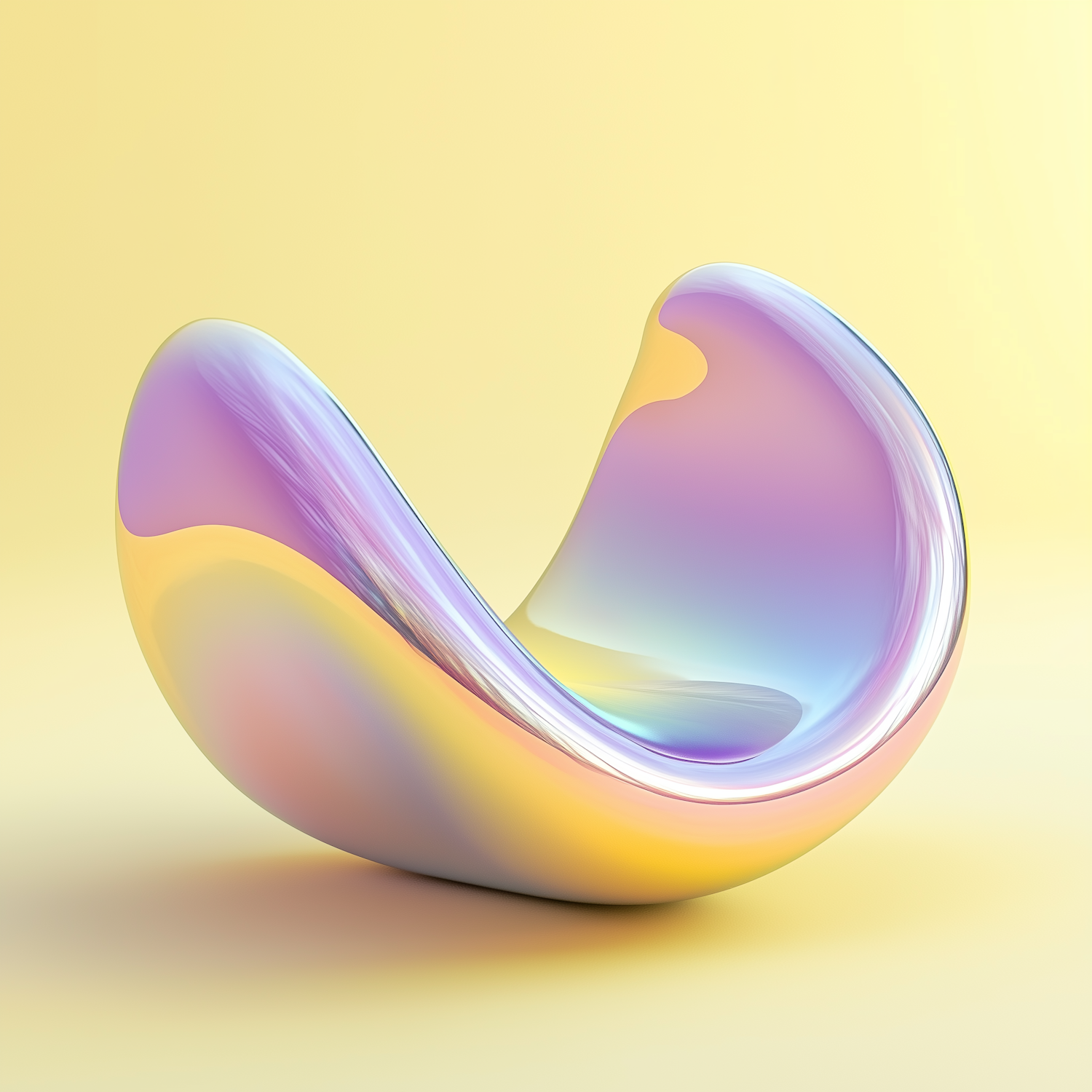 A glossy, iridescent 3D sculpture with pastel gradients and fluid curves, set against a soft yellow background.