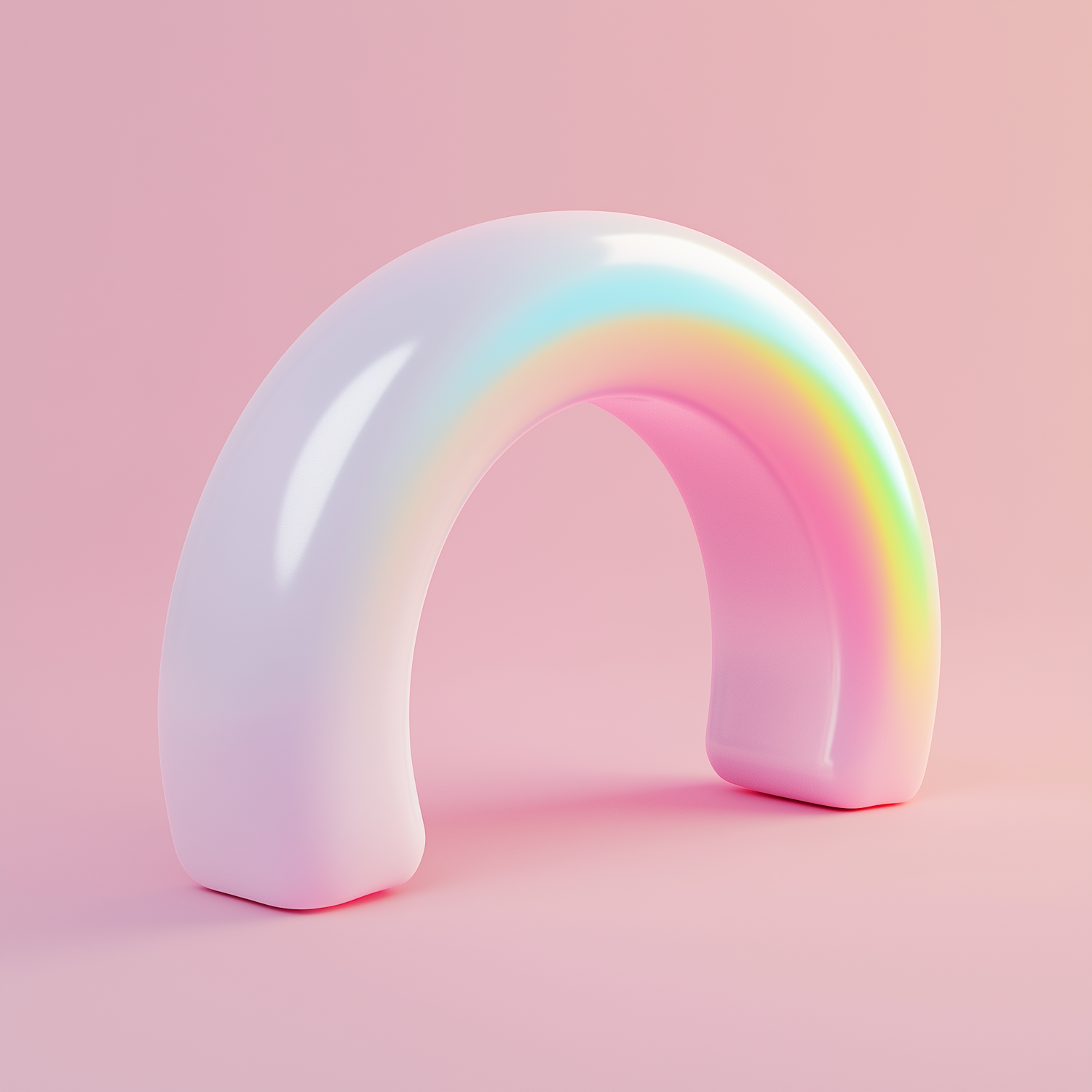 A glossy white arch with a soft rainbow gradient on a pastel pink background, creating a dreamy and minimalist 3D aesthetic.