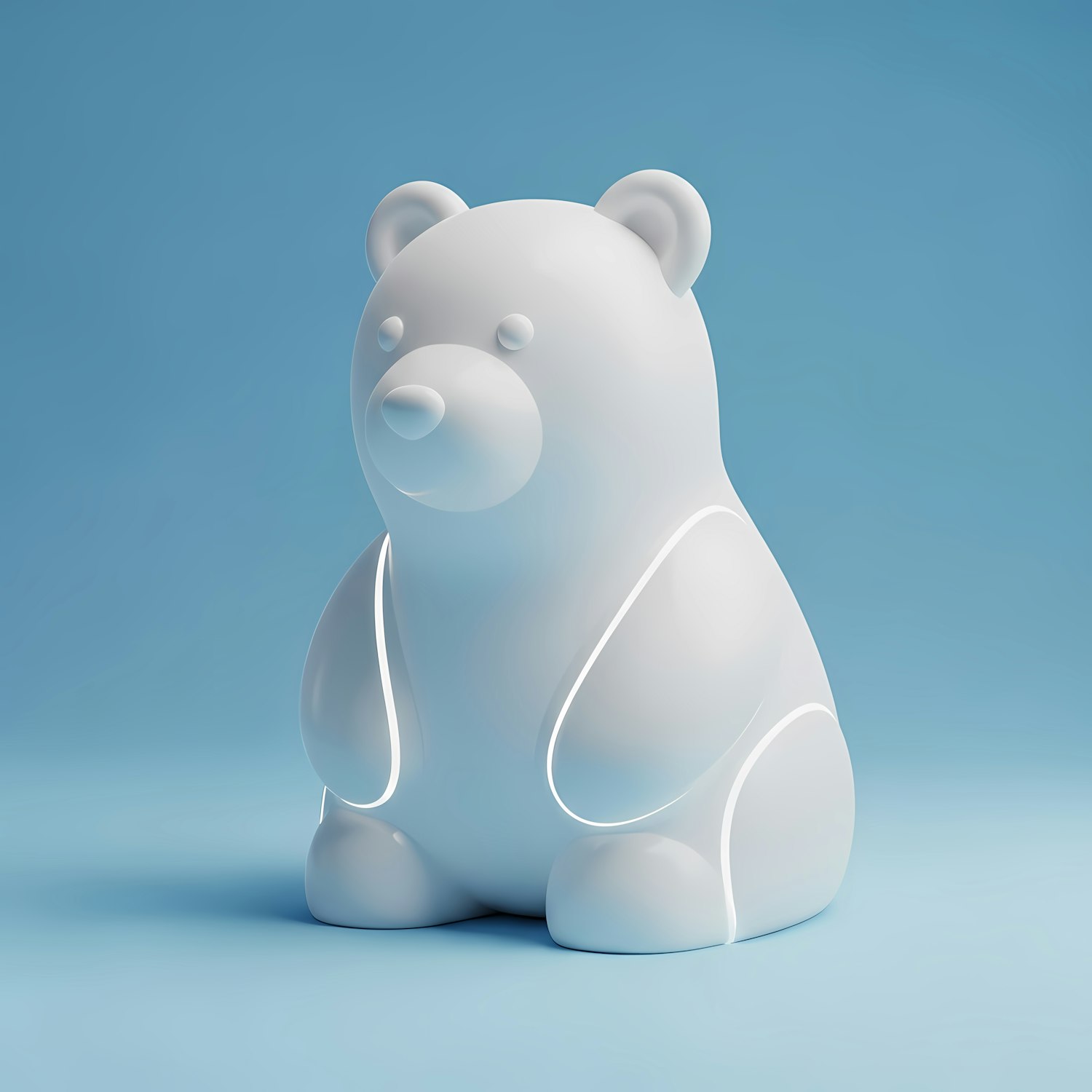 A sleek white bear sculpture with a glossy finish against a gradient blue background, showcasing modern and minimalist design.