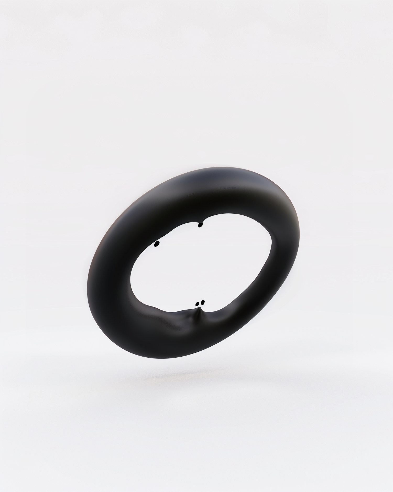 A glossy black torus with subtle indentations floats against a white background, creating a minimalistic and elegant visual.