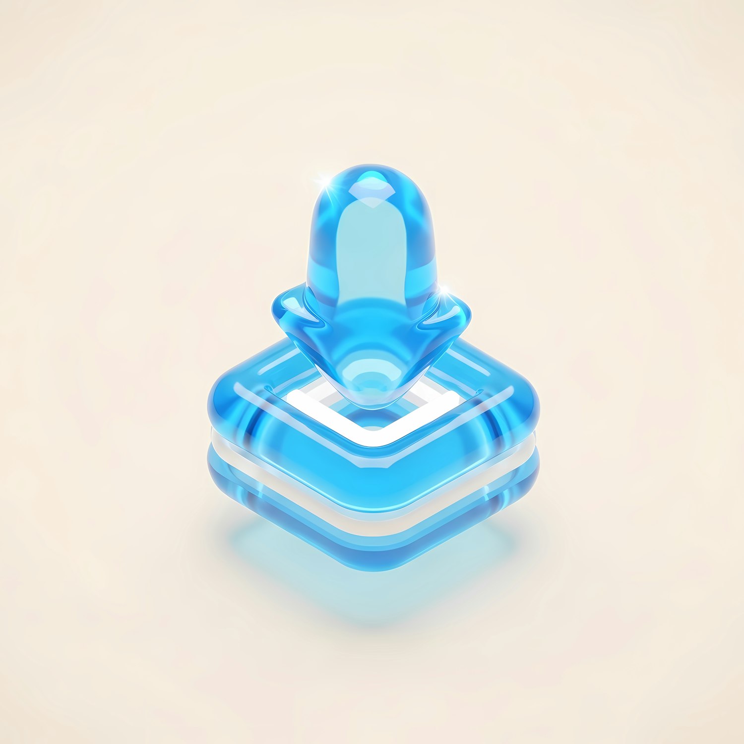 Glossy 3D blue arrow icon with a layered square base on a soft beige background, perfect for download or navigation themes.