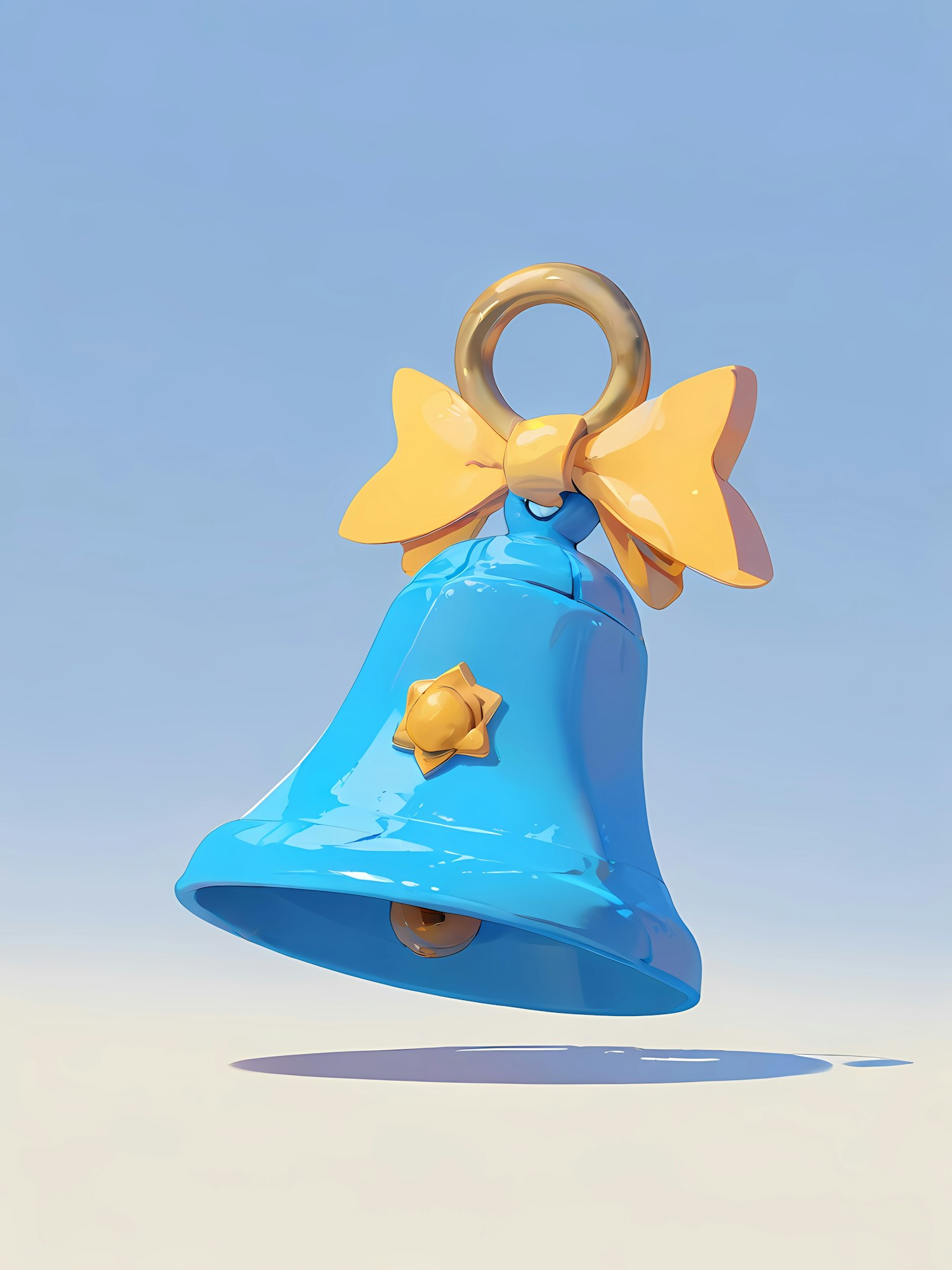 A glossy blue bell with a golden star, yellow bow, and loop handle against a soft blue background. Whimsical and cheerful design.