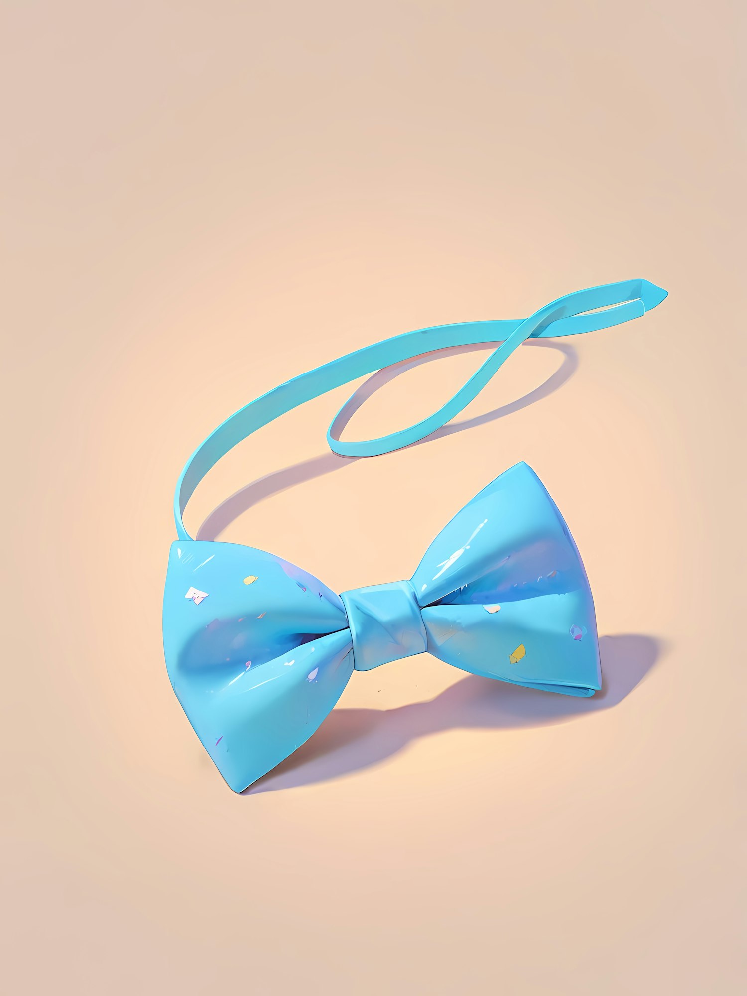 Glossy blue bow tie with colorful specks on a beige background, perfect for adding a playful touch to formal wear.