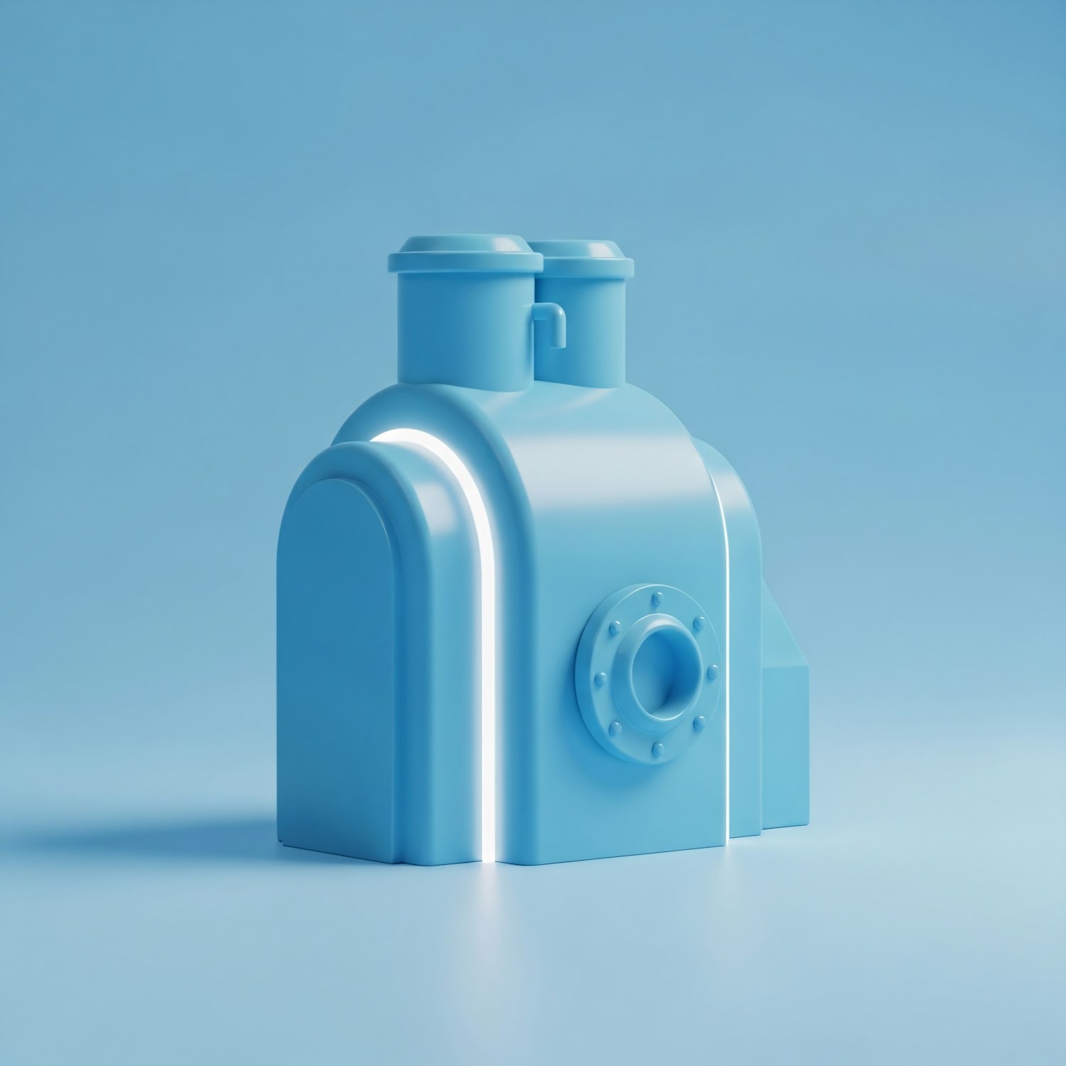A sleek 3D-rendered blue industrial component with smooth edges and a modern design, set against a gradient blue background.