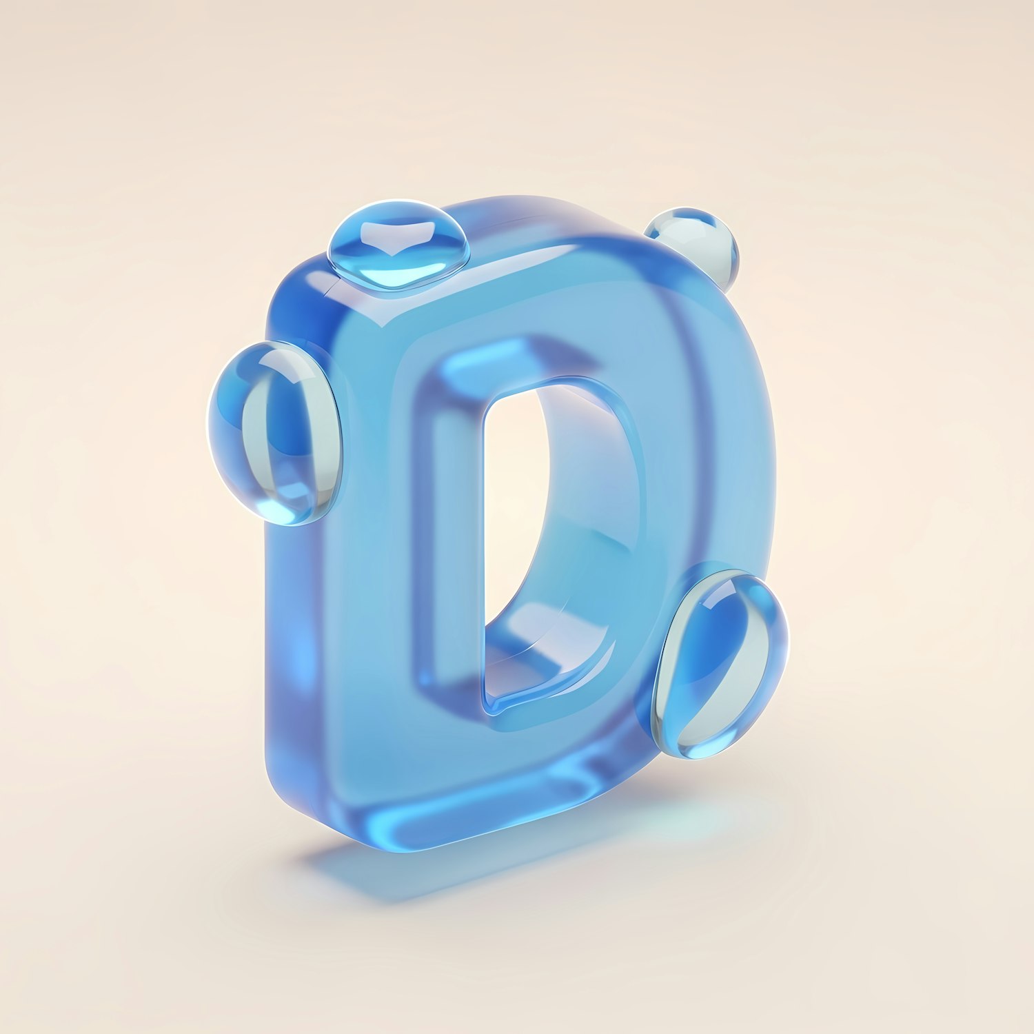 A 3D-rendered translucent blue letter 'D' with glossy droplets on a soft beige gradient background, showcasing modern design.