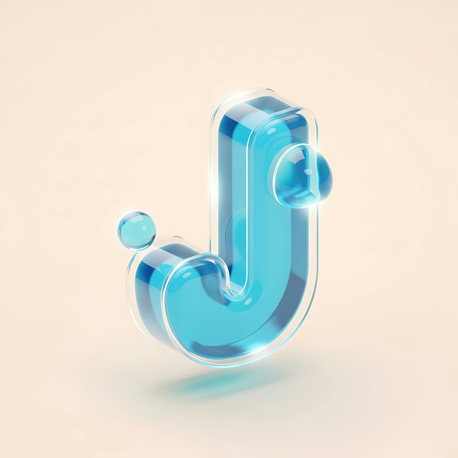 A 3D-rendered glossy blue letter 'J' with a transparent look, set against a soft beige background, featuring smooth and reflective details.