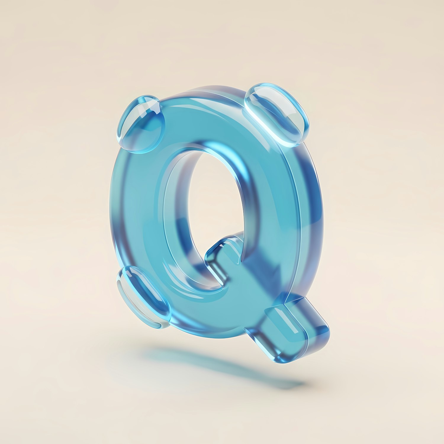 A 3D-rendered translucent blue letter 'Q' with a glossy finish, set against a soft beige background, showcasing modern design.