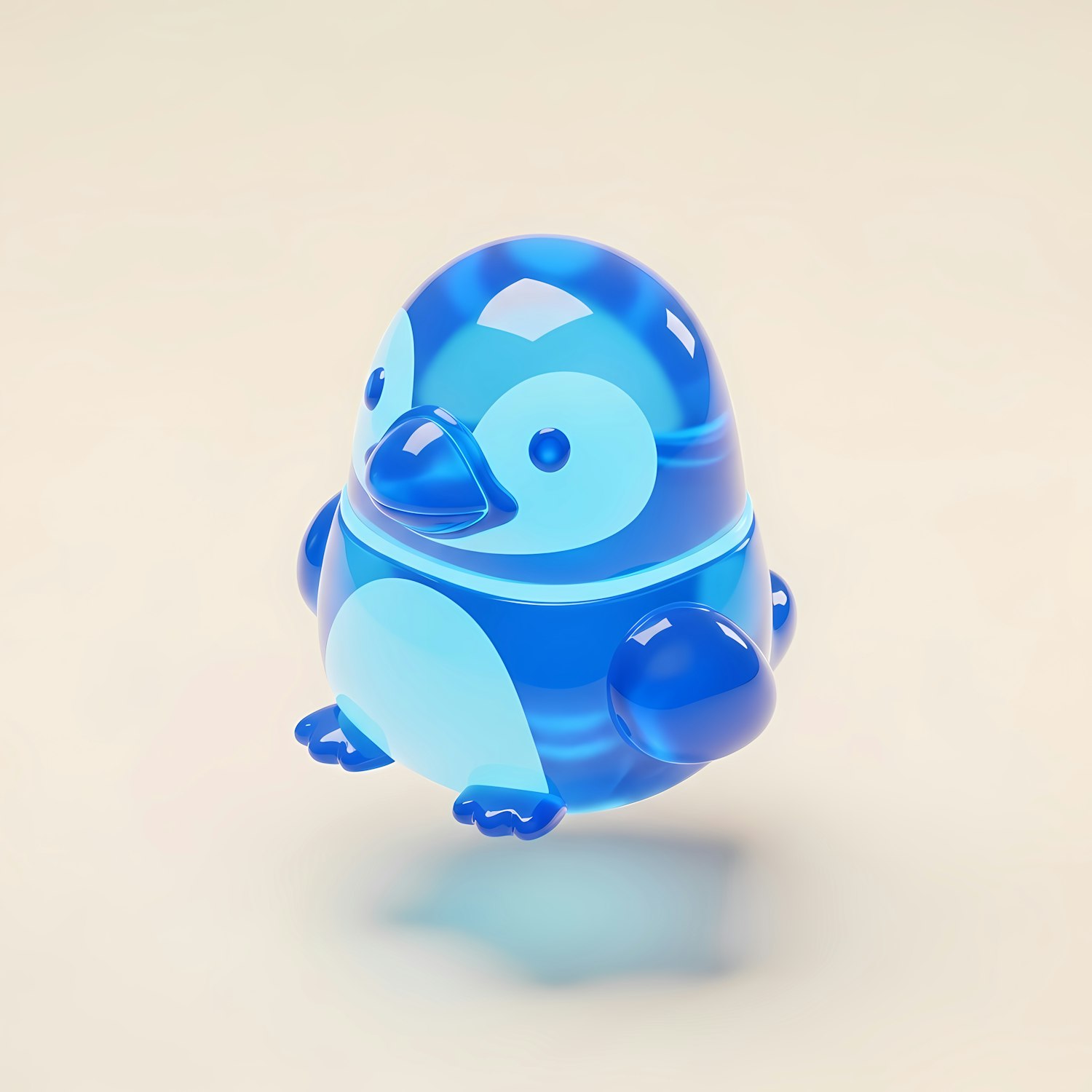 A glossy blue 3D penguin figurine with a smooth, reflective surface, set against a soft neutral background.