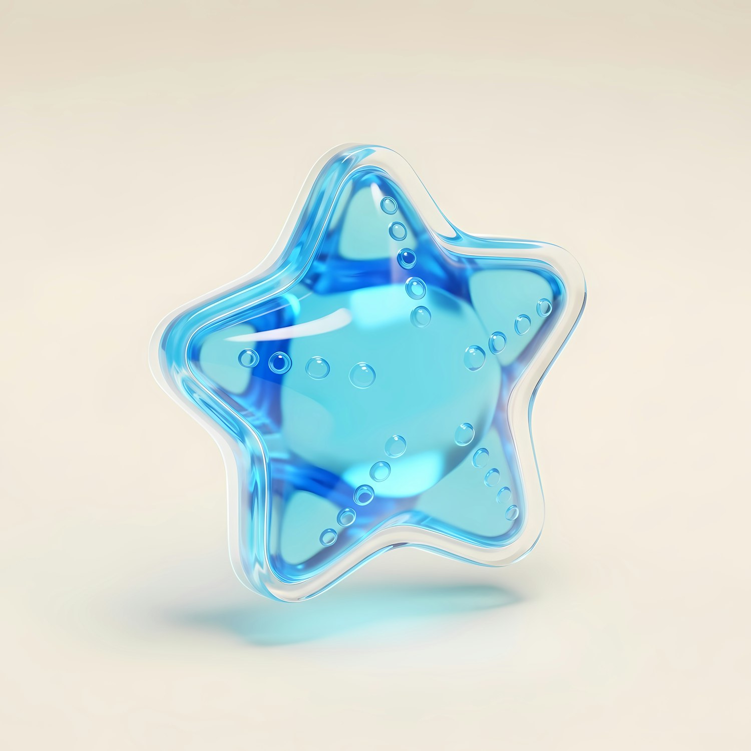 A glossy blue star-shaped object with bubble details, set against a soft beige background, creating a clean and modern aesthetic.