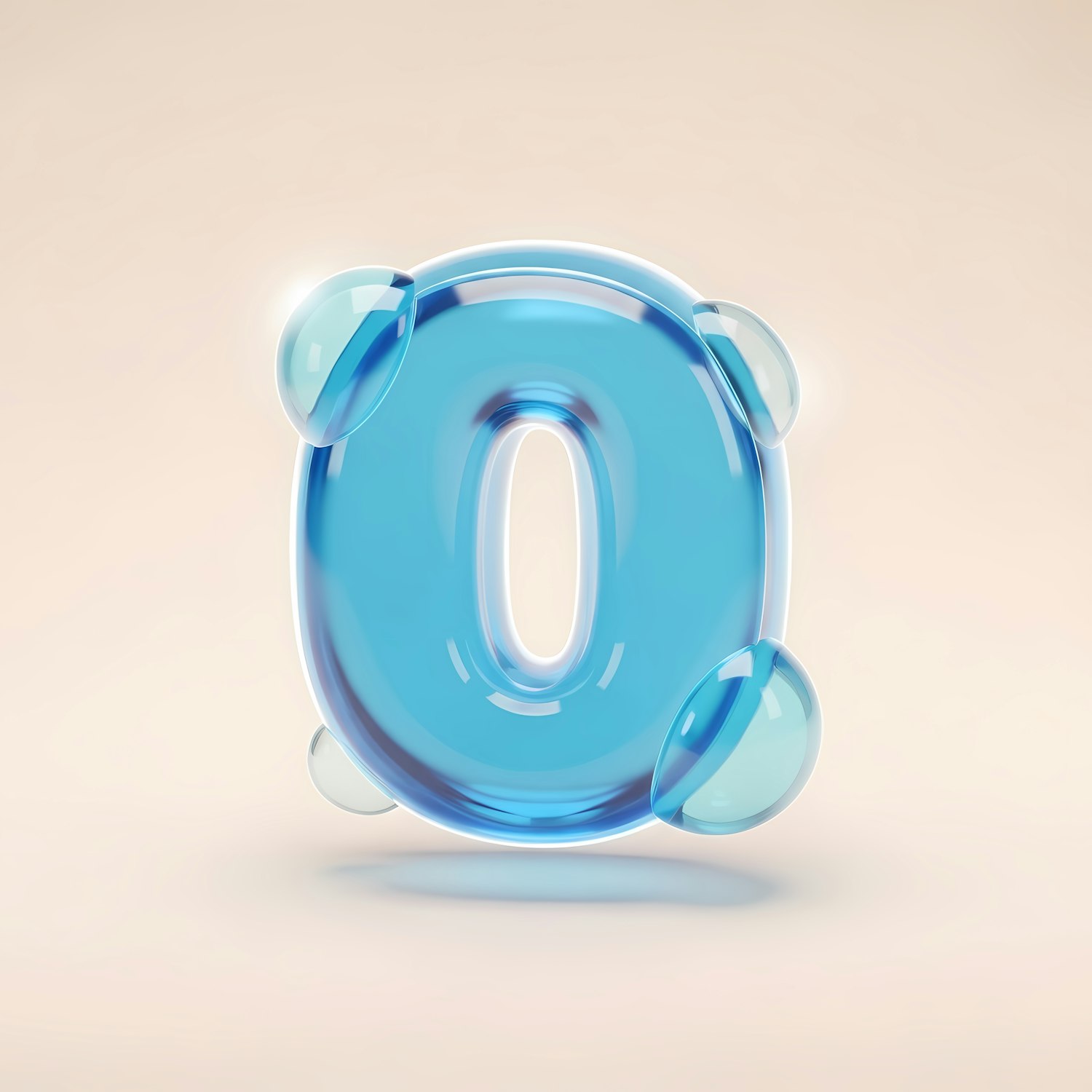 A glossy, translucent blue 3D number zero with bubble-like accents on a soft beige background, creating a modern and playful design.