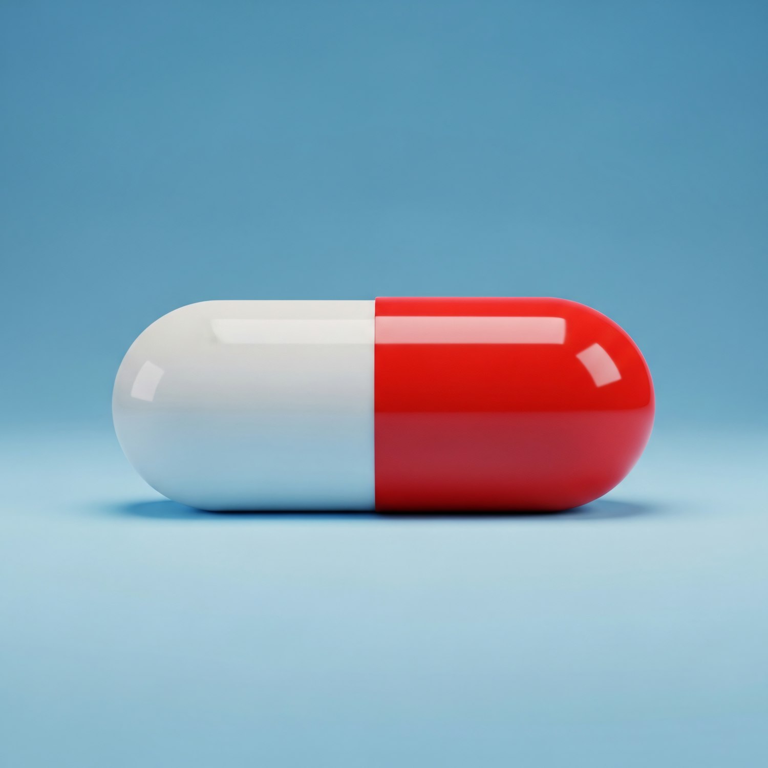 A glossy red and white capsule pill on a light blue background, showcasing its smooth texture and vibrant colors.