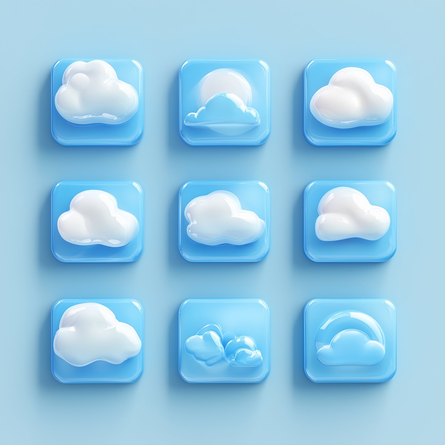Glossy 3D cloud icons in a grid, featuring various designs like sun and rainbow accents, set against a light blue background.