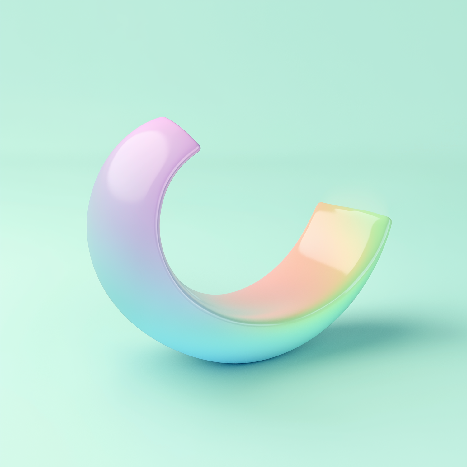 A glossy crescent-shaped object with pastel gradient colors on a mint green background, creating a modern and minimalist aesthetic.