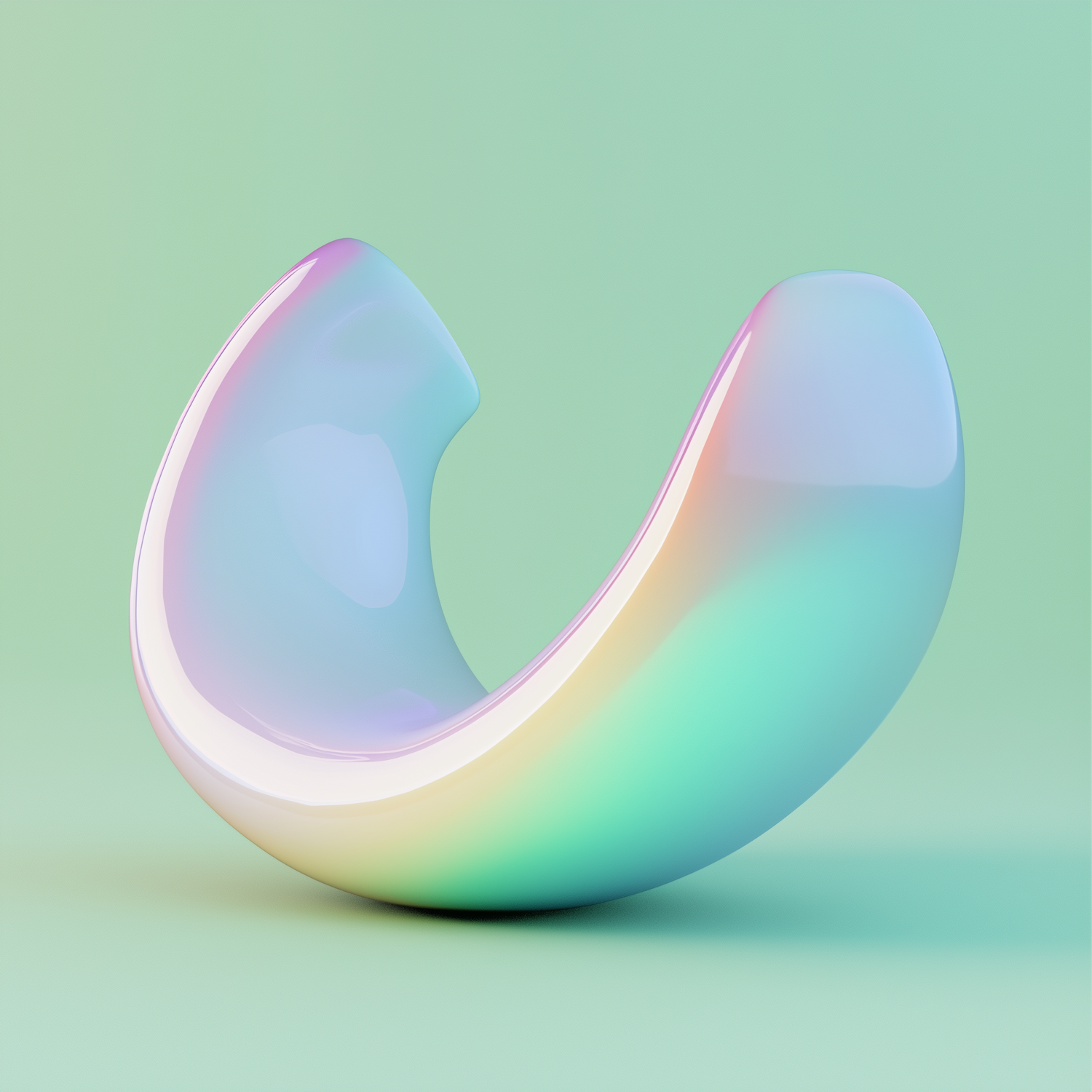 A glossy crescent-shaped 3D object with pastel iridescent hues on a soft green background, creating a dreamy and modern aesthetic.