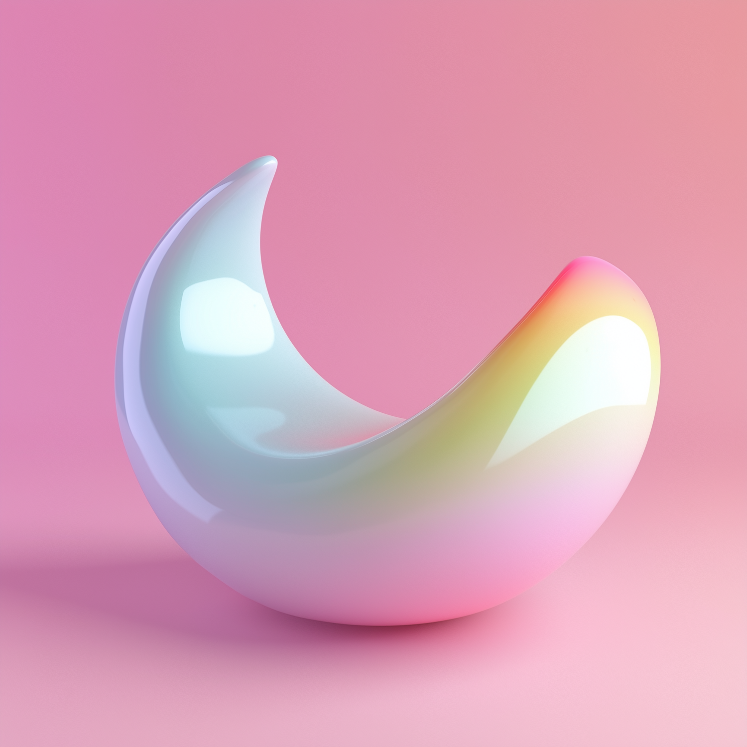 Glossy crescent-shaped object with pastel gradient colors on a soft pink background, creating a dreamy and modern aesthetic.
