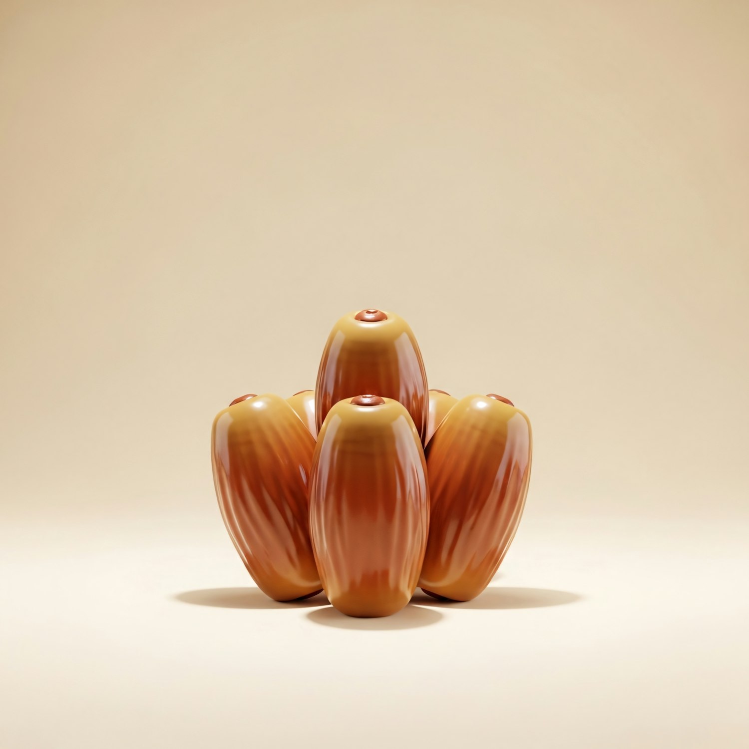 A close-up of glossy, caramel-colored objects resembling dates, arranged symmetrically against a soft beige background.