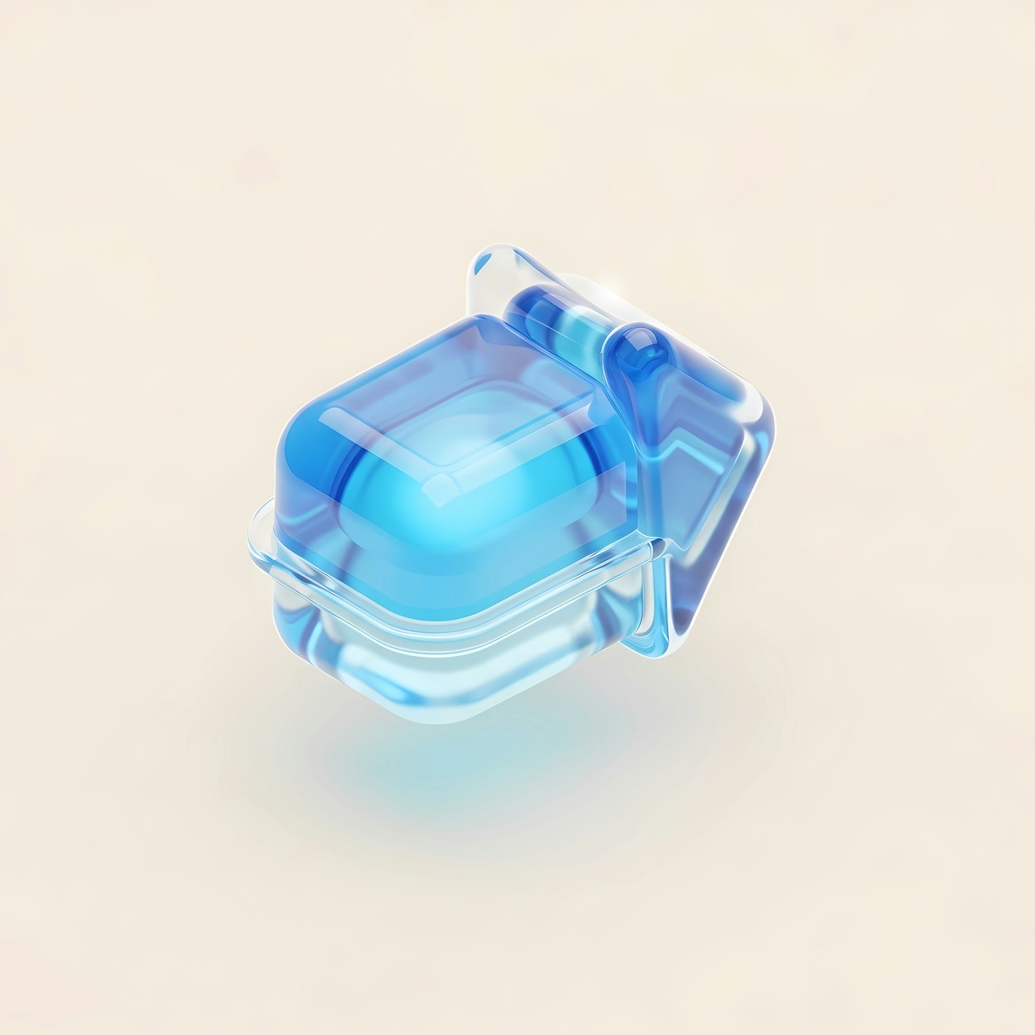 A sleek, translucent blue detergent pod with a glossy finish, set against a clean beige background, showcasing its modern design.