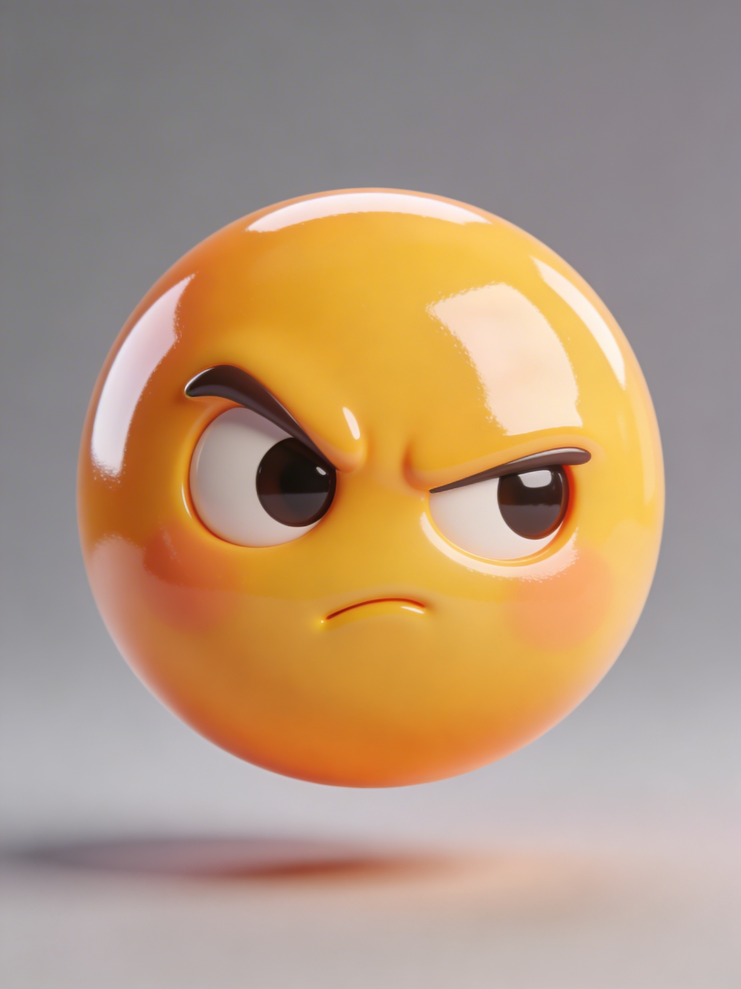 A 3D-rendered glossy yellow emoji with a displeased expression, featuring furrowed brows and a slight frown, set against a neutral background.