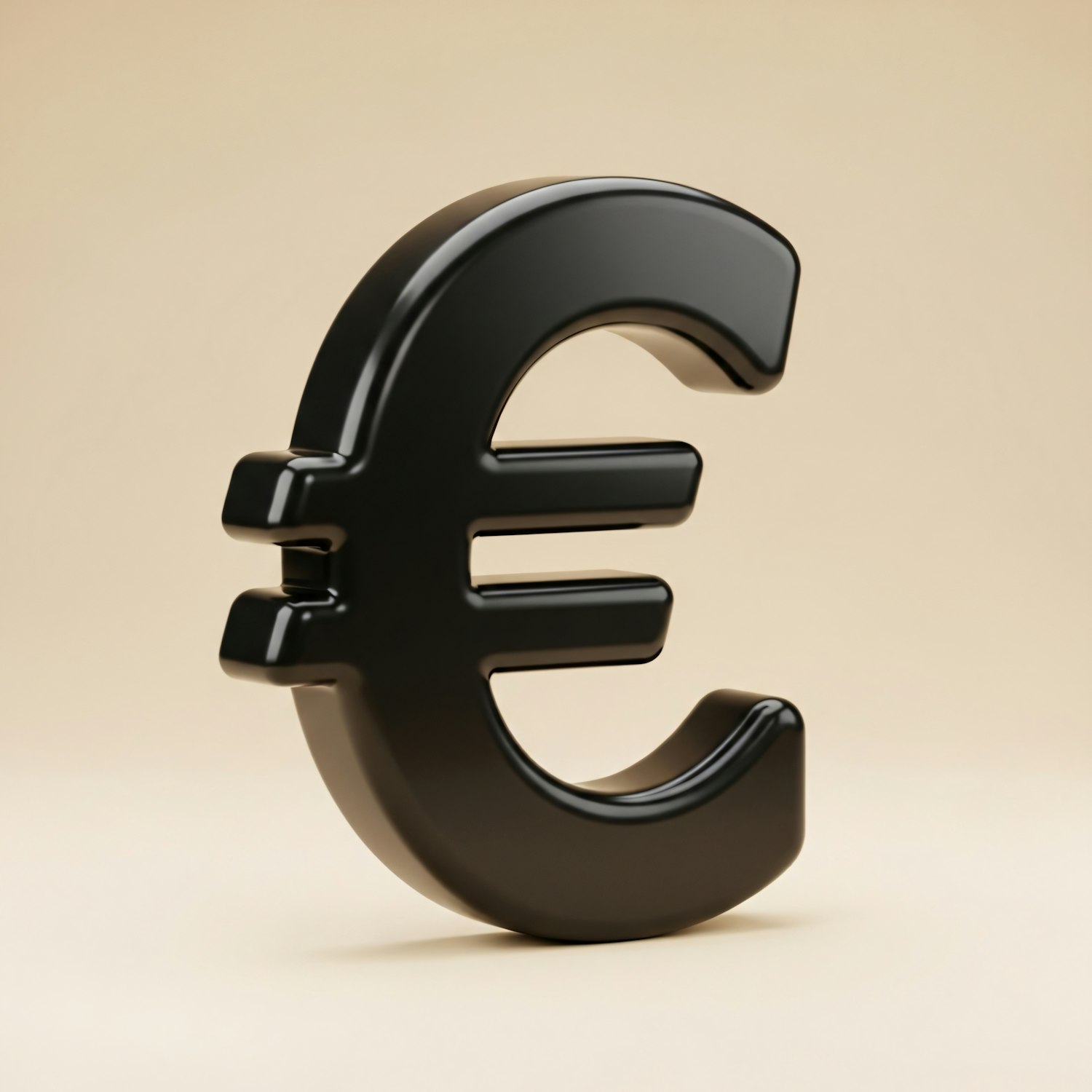 A glossy black Euro symbol in 3D design stands out against a soft beige background, showcasing a modern and minimalist aesthetic.
