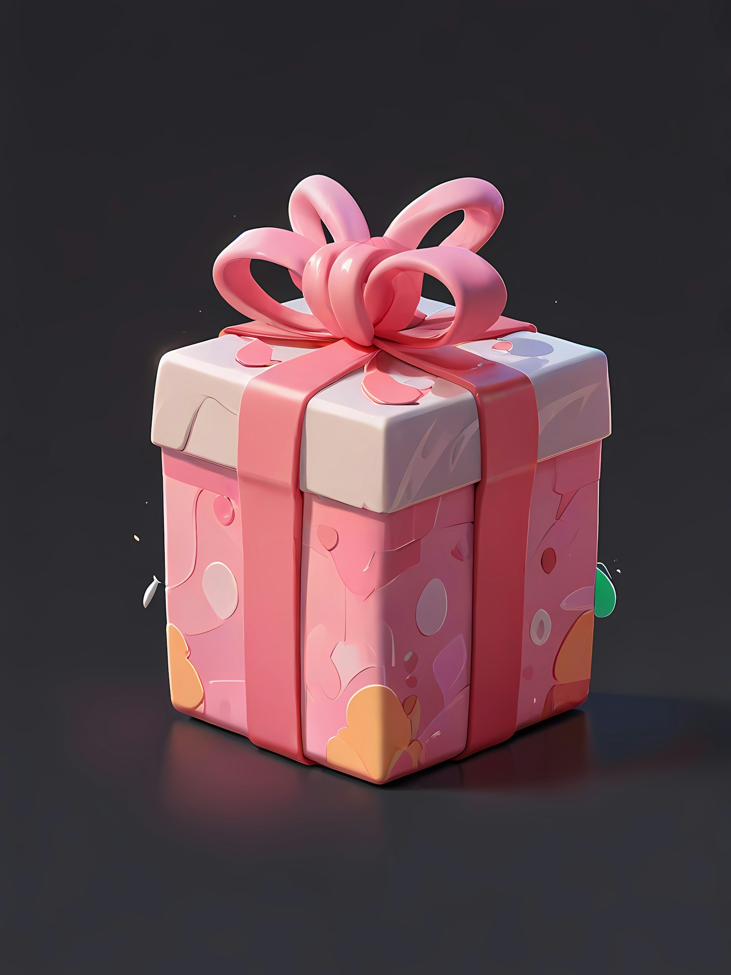 A glossy 3D-rendered pink gift box with a shiny ribbon and abstract patterns, set against a dark background for a striking contrast.