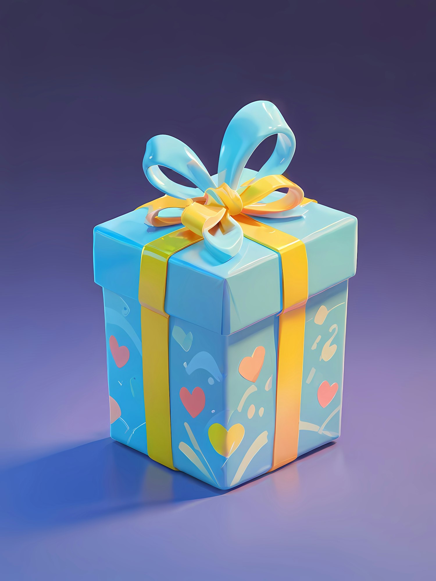 Glossy 3D gift box with a blue base, yellow ribbon, and heart patterns, set against a dreamy purple gradient background.