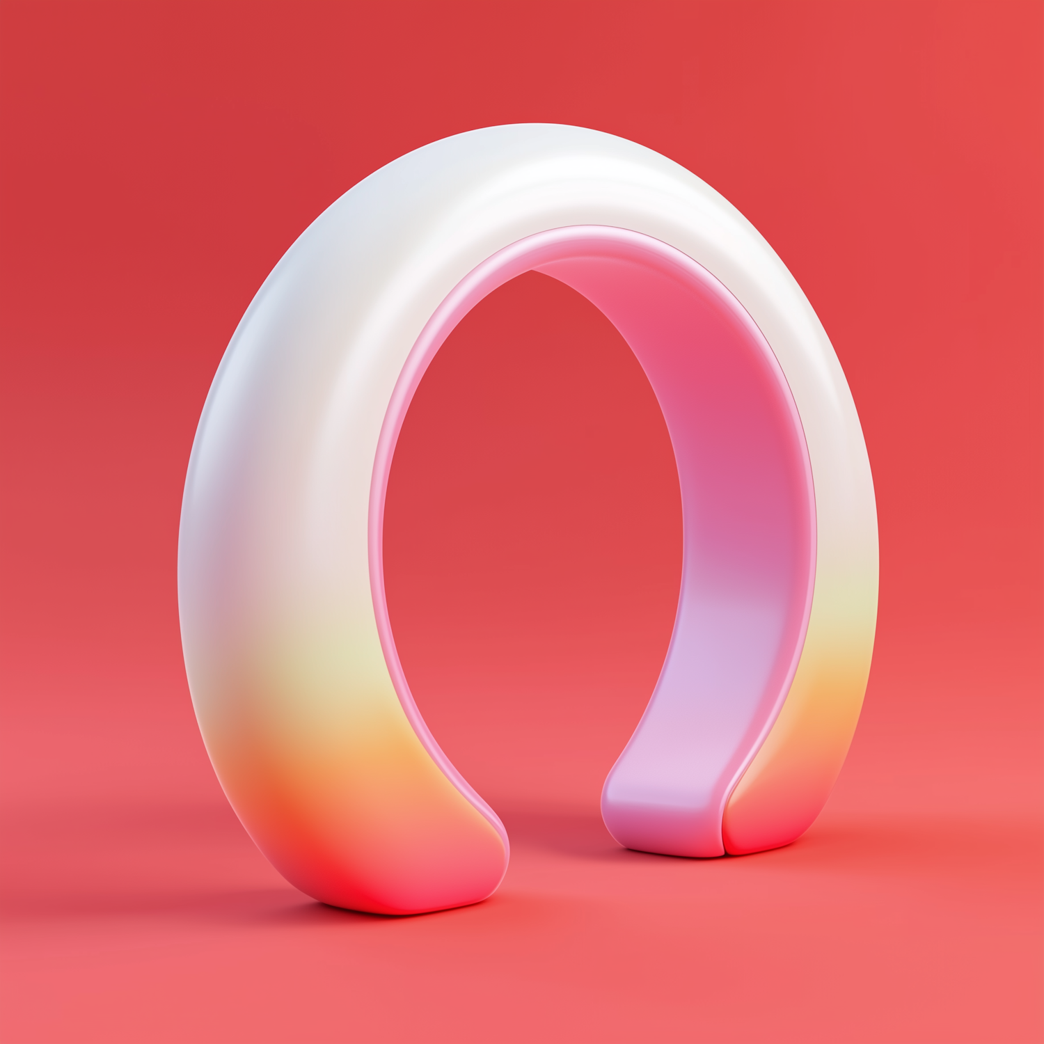 A glossy 3D horseshoe-shaped object with a white-to-pink gradient finish, set against a bold red background for a modern, artistic vibe.