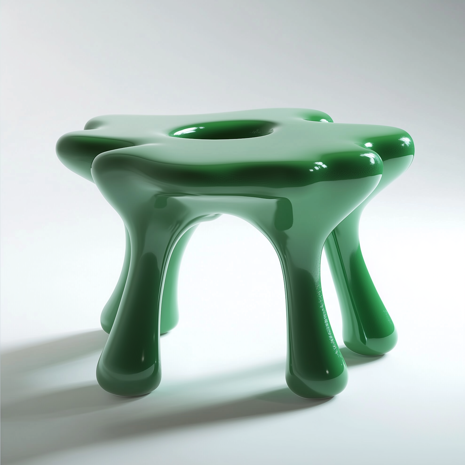 Glossy green sculptural stool with organic curves and a futuristic design, featuring a central indentation and rounded legs.