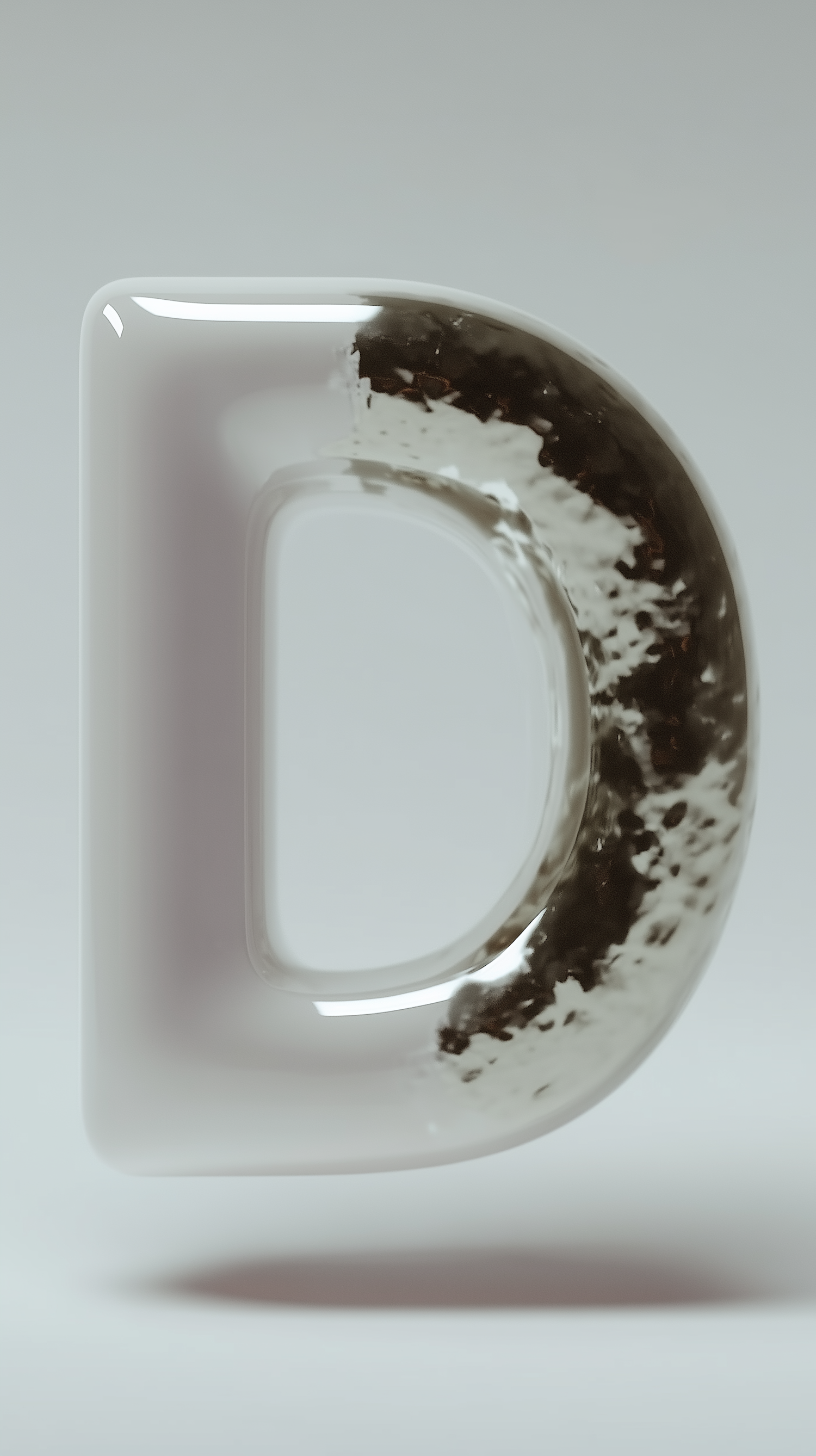 A 3D-rendered glossy letter 'D' with a marbled texture on one side, set against a neutral background.