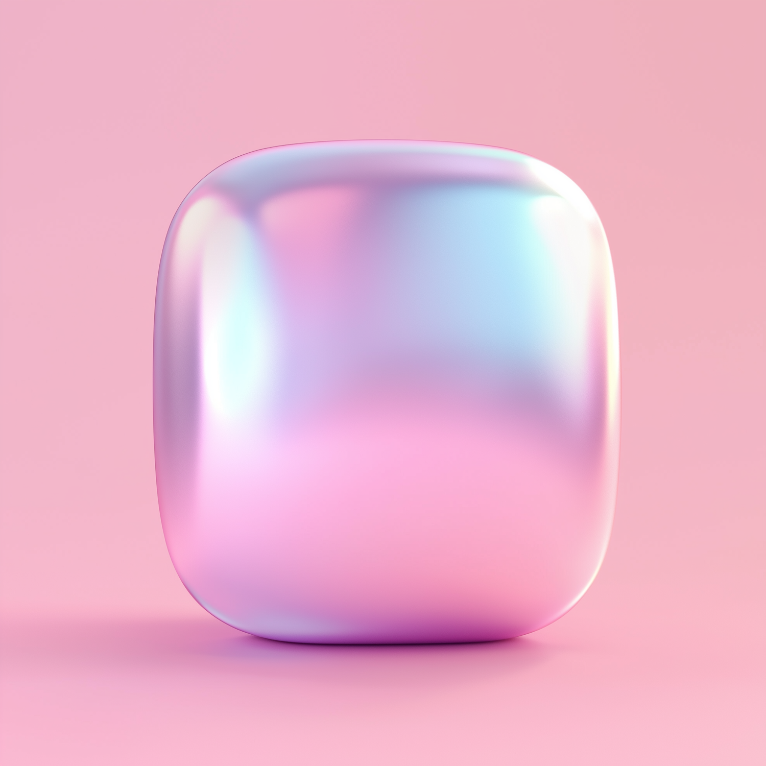 Glossy pastel cube with metallic hues of pink, blue, and purple on a soft pink background, creating a dreamy and futuristic vibe.