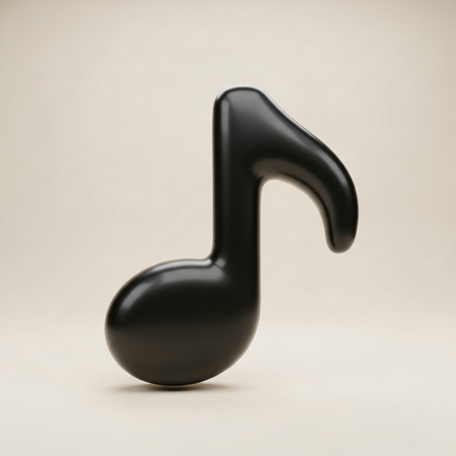 A glossy black 3D musical note sculpture on a neutral beige background, showcasing a sleek and modern design.