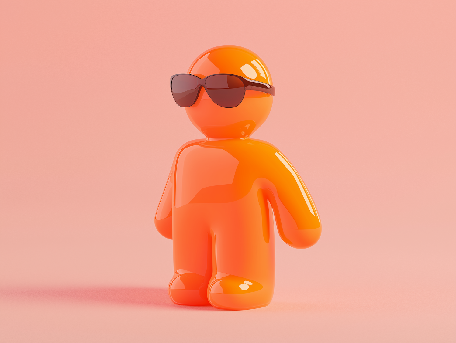 Glossy orange humanoid figure with black sunglasses on a peach background. Minimalist and vibrant design with a playful, modern vibe.