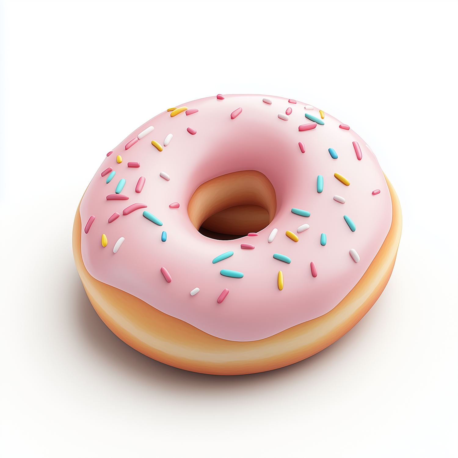 A delicious 3D-rendered donut with pink icing and colorful sprinkles on a clean white background. Perfect for food lovers!