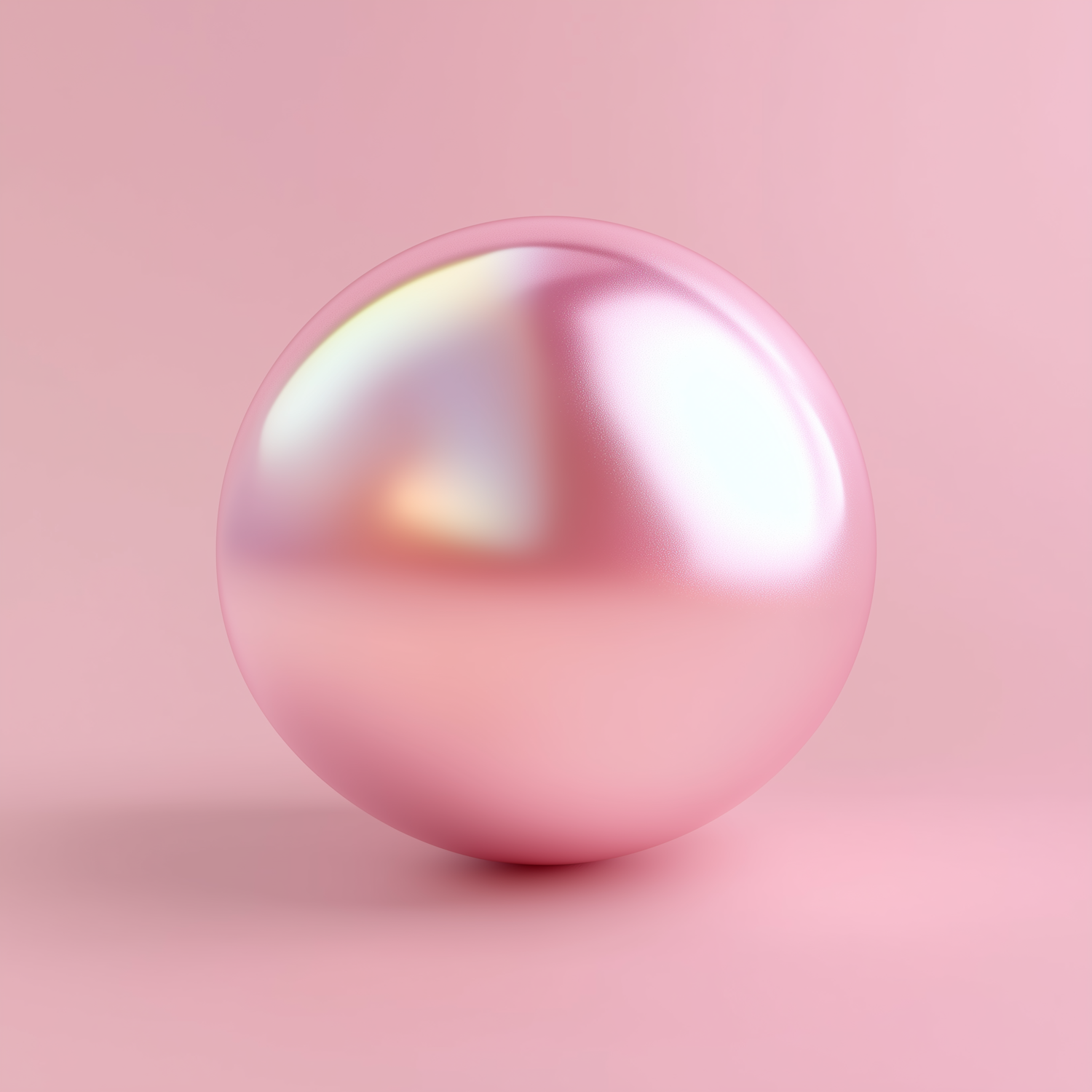 A glossy pink sphere with a pearlescent finish sits against a matching pink background, reflecting soft light and subtle colors.