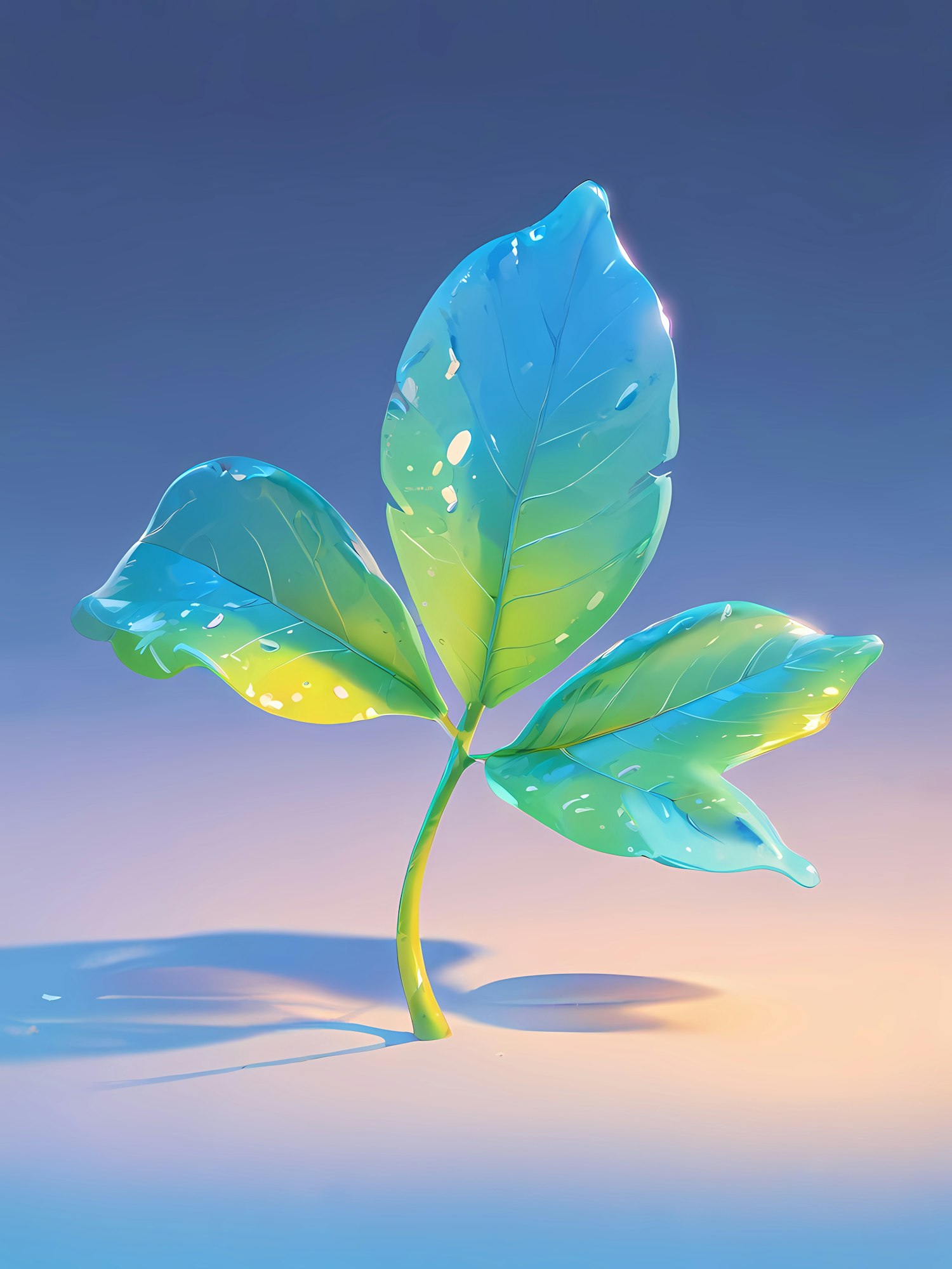A stunning digital illustration of a glossy three-leaf plant with water droplets, set against a serene gradient background.