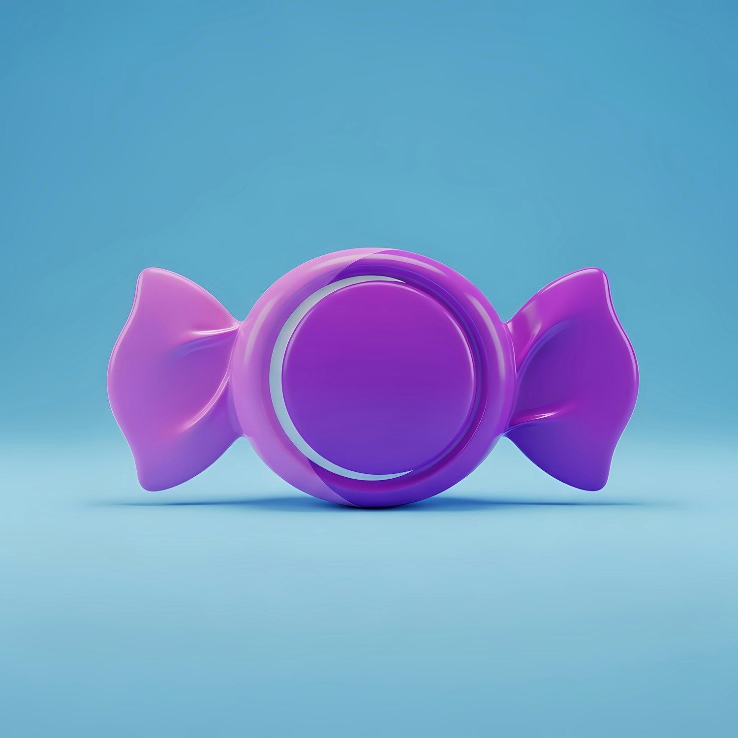 Glossy purple candy in a 3D render, wrapped symmetrically, on a clean blue background. Perfect for sweet-themed designs.