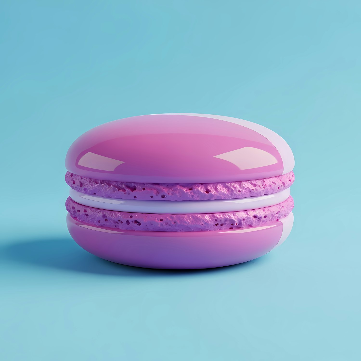 A glossy purple macaron with a textured filling, set against a light blue background, rendered in a vibrant 3D style.