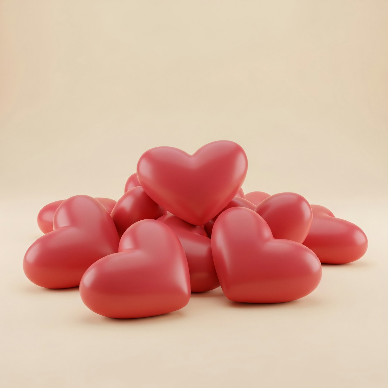 A pile of glossy red heart shapes on a soft beige background, creating a warm and inviting visual with a polished look.