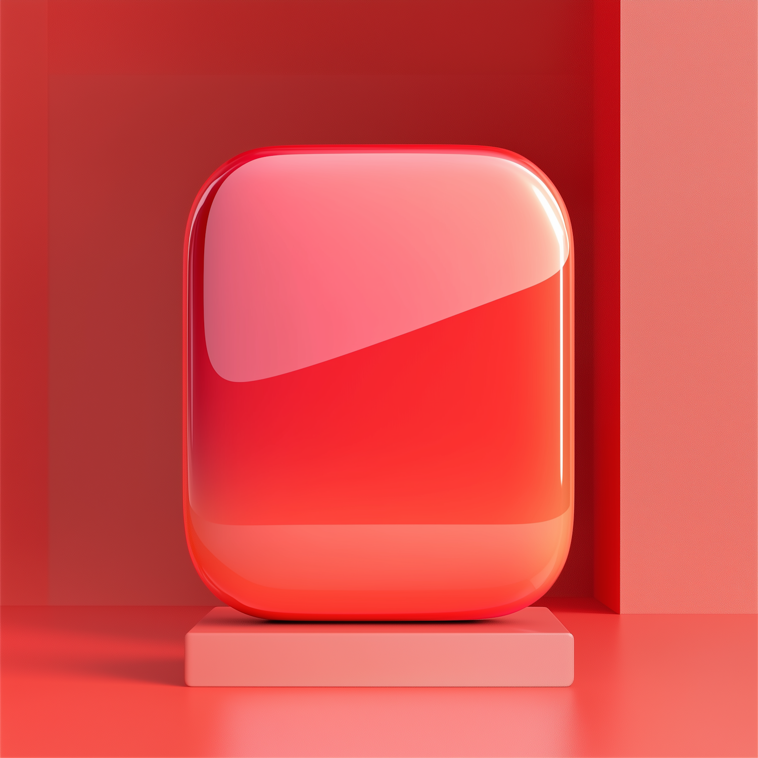 Glossy red rounded square object on a minimal pedestal in a monochromatic red setting, showcasing a modern and sleek design.