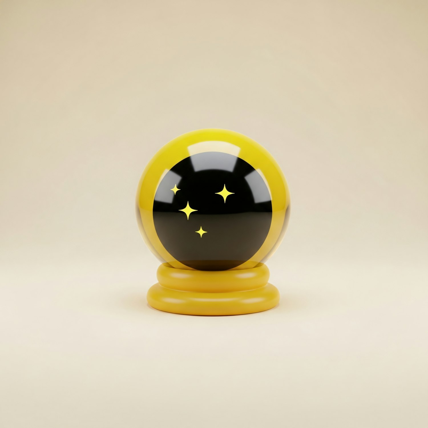 A glossy black sphere with yellow stars and a yellow border on a matching base, set against a neutral beige background.