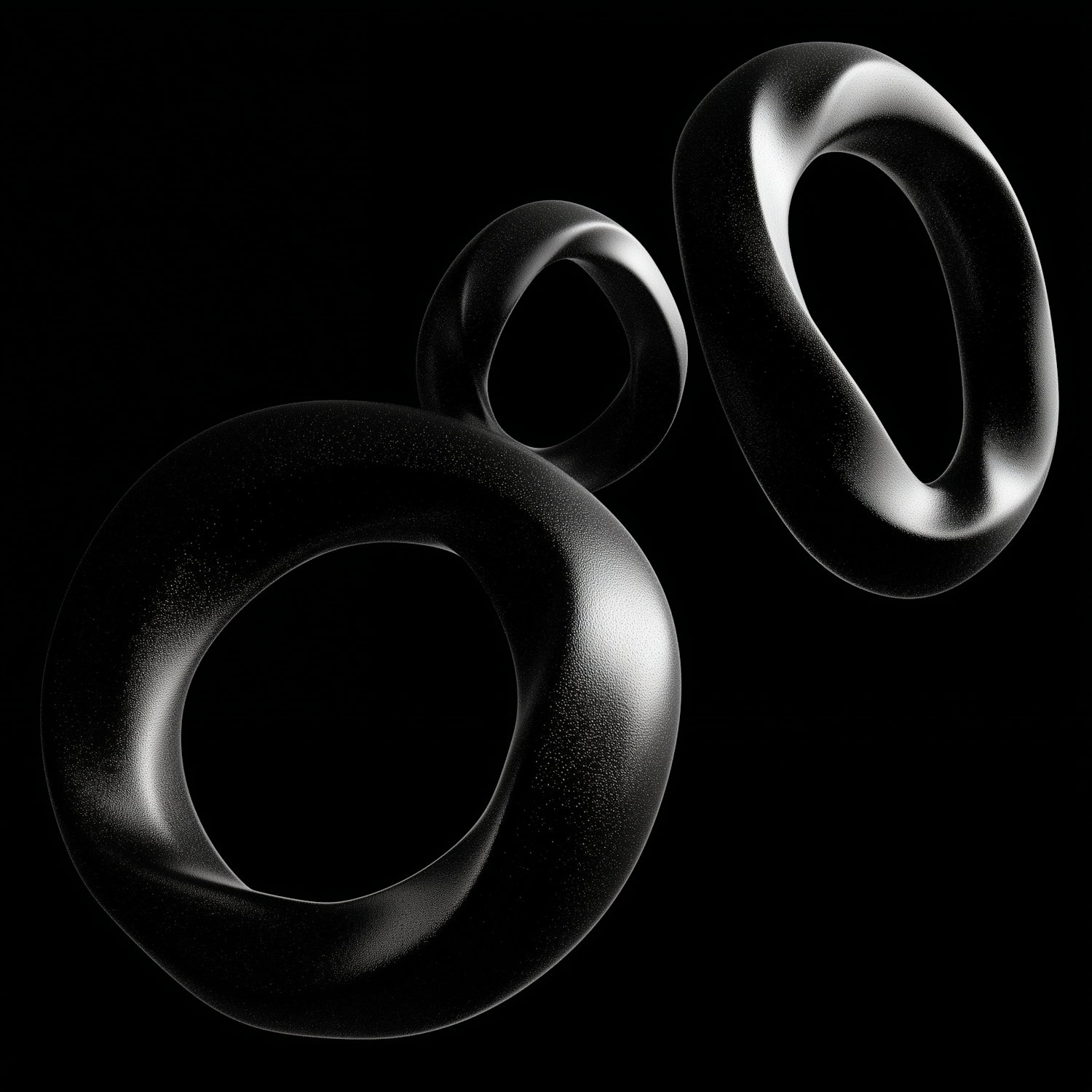 Abstract black toroidal shapes with a glossy finish, floating against a black background, showcasing modern and dynamic design.