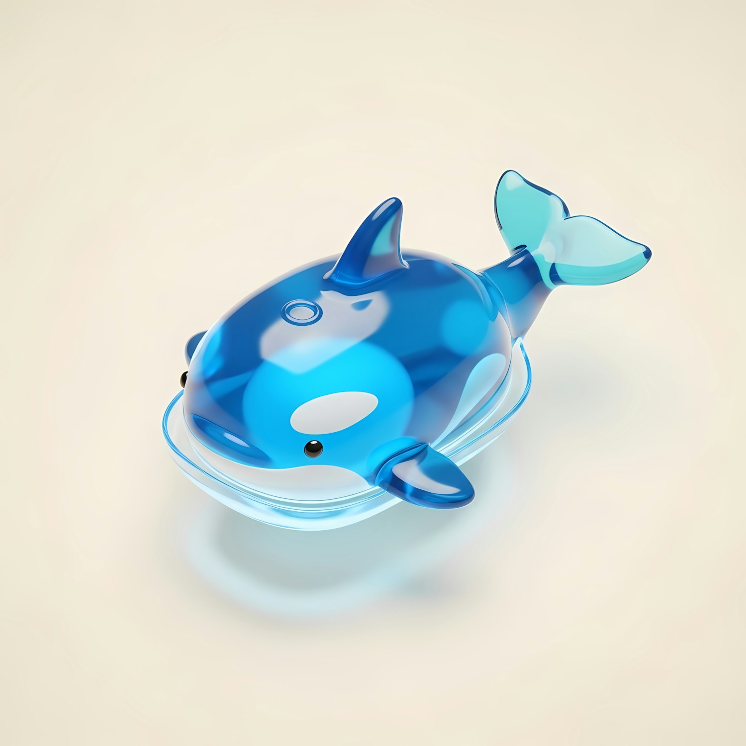 A cute 3D-rendered blue whale toy with a glossy finish and white accents, set against a soft beige background.
