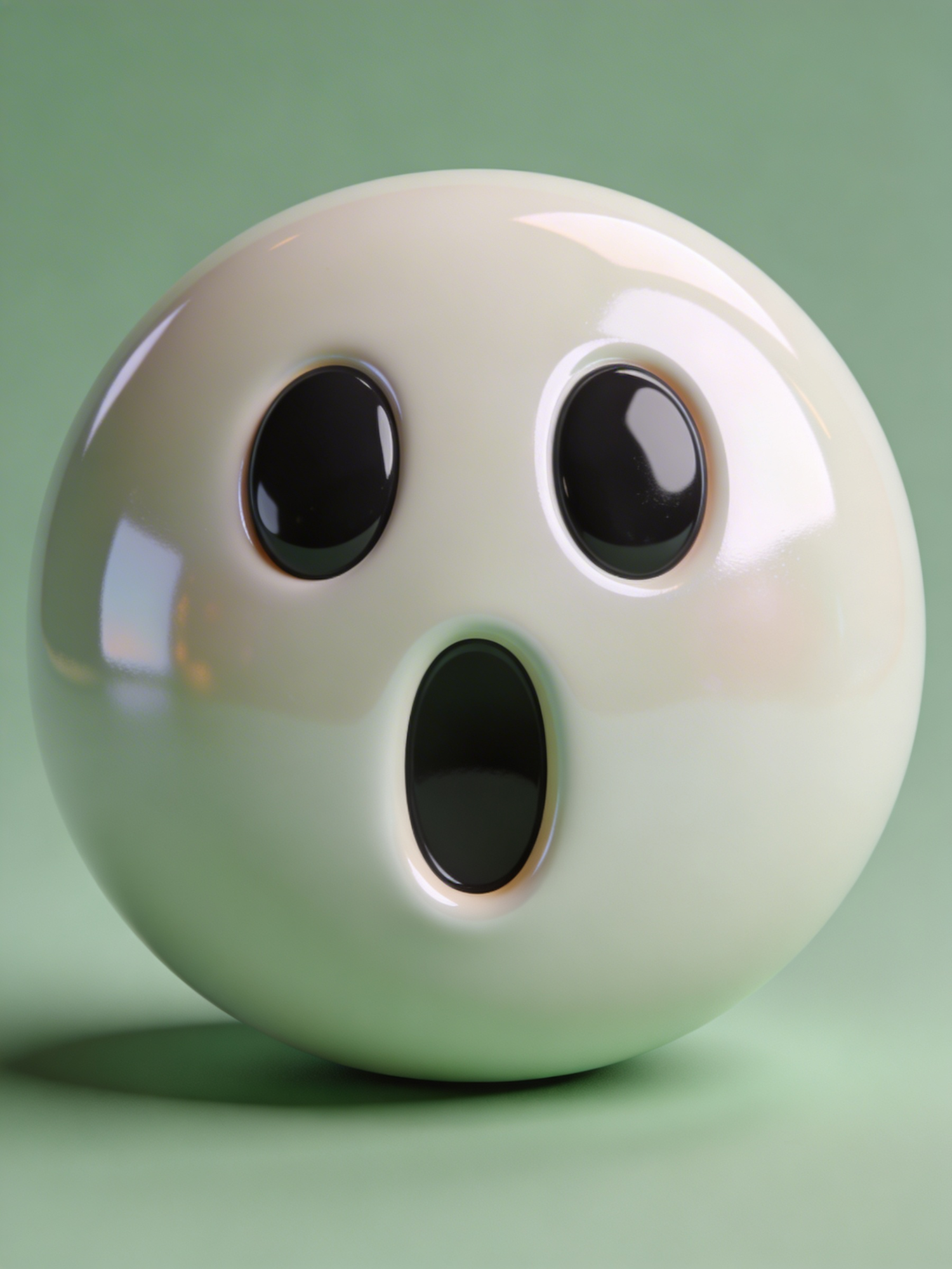 A glossy white spherical object with a surprised face design, featuring black oval eyes and mouth, set against a soft green background.