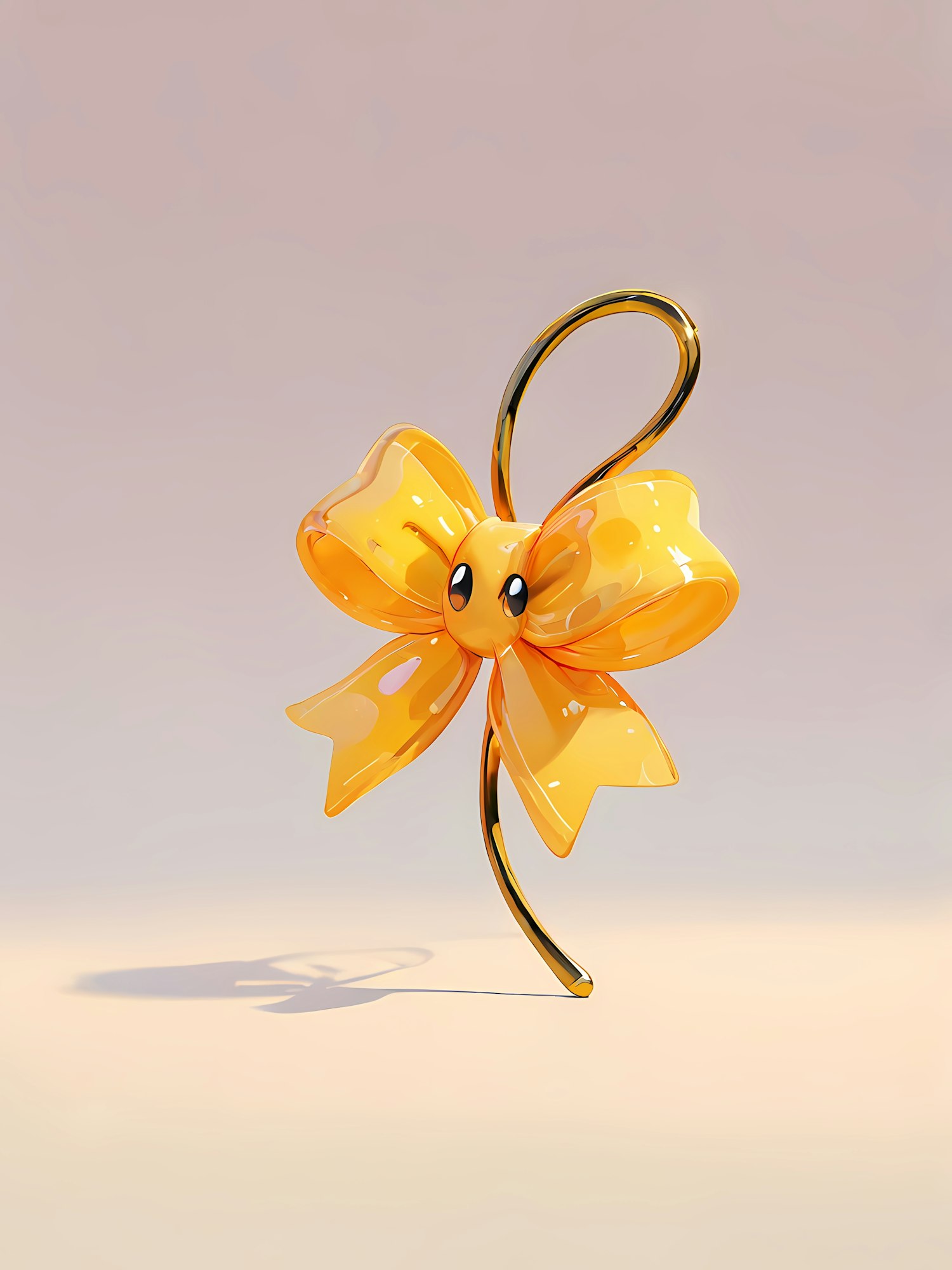 Glossy yellow bow with a cute face and golden hook, set against a soft beige background. Perfect mix of whimsy and elegance.